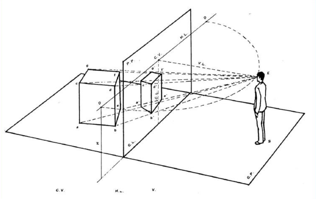 透明画面: 观者与被观物象之间,假设的一个与视线垂直的透明平面。