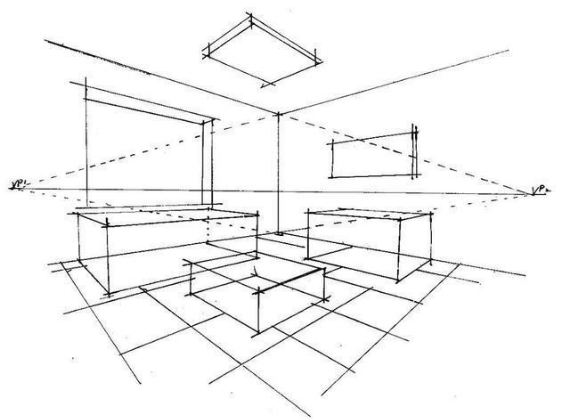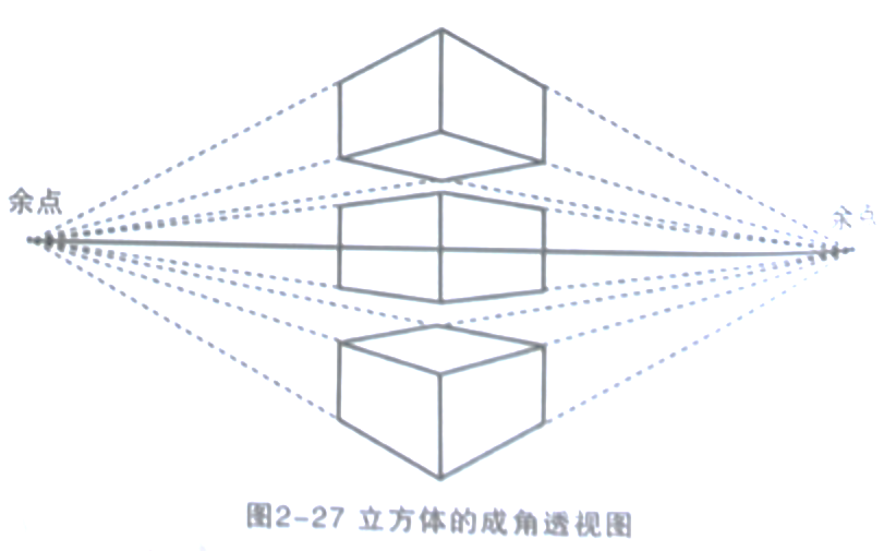 成角透视 (两点透视): 物体的上、下两个面与地面平行,观者能够看到的面与画面成一定角度时,所产生的透视现象。立方体的任何一个面都产生了缩形现象,失去了正方形的形状。立方体中与画面呈一定角度的两组线分别向左右两个方向汇集,消失在视平线上的两个余点。