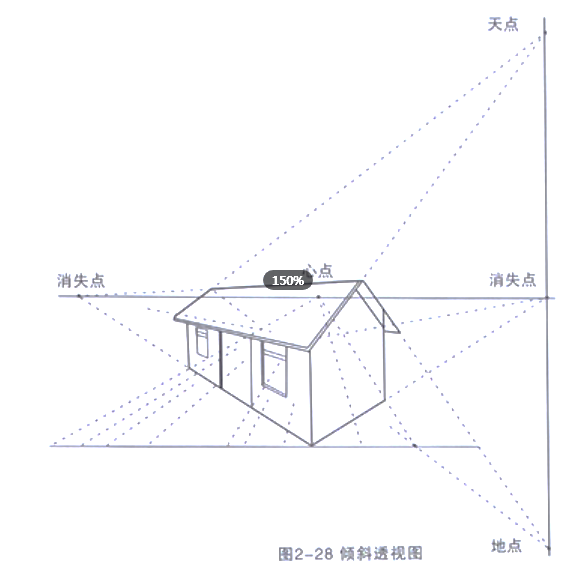 视点太高或太低,产生俯视倾斜透视或仰视倾斜透视现象。 凡一个平面与水平面成一边高一边低的情况时,凡是近高远低的向下倾斜,或近低远高的向上倾斜。它们都有各自的灭点,向上的倾斜线向视平线上方汇集,消失于天点(也称天际点);向下的倾斜线向视平线下方汇集,消失于地点(也称地下点)。天点和地点一定是在灭点的垂直线上。