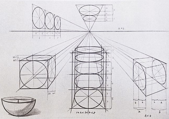 圆的透视: 圆面、圆柱体的透视是以方形透视变化为基础的,只要借助相应的方形或立方体的透视状态,即可画出与之相对应状态下的圆形、圆柱体的透视变化。圆面透视变形后形状为椭圆形。