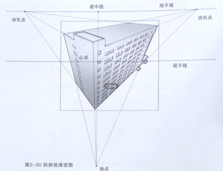 距点: 在画面上,以主点为圆心,视距为半径作一个半圆,在此半圆上的任意一点都称为距点,常用的是在视平线上的距点。