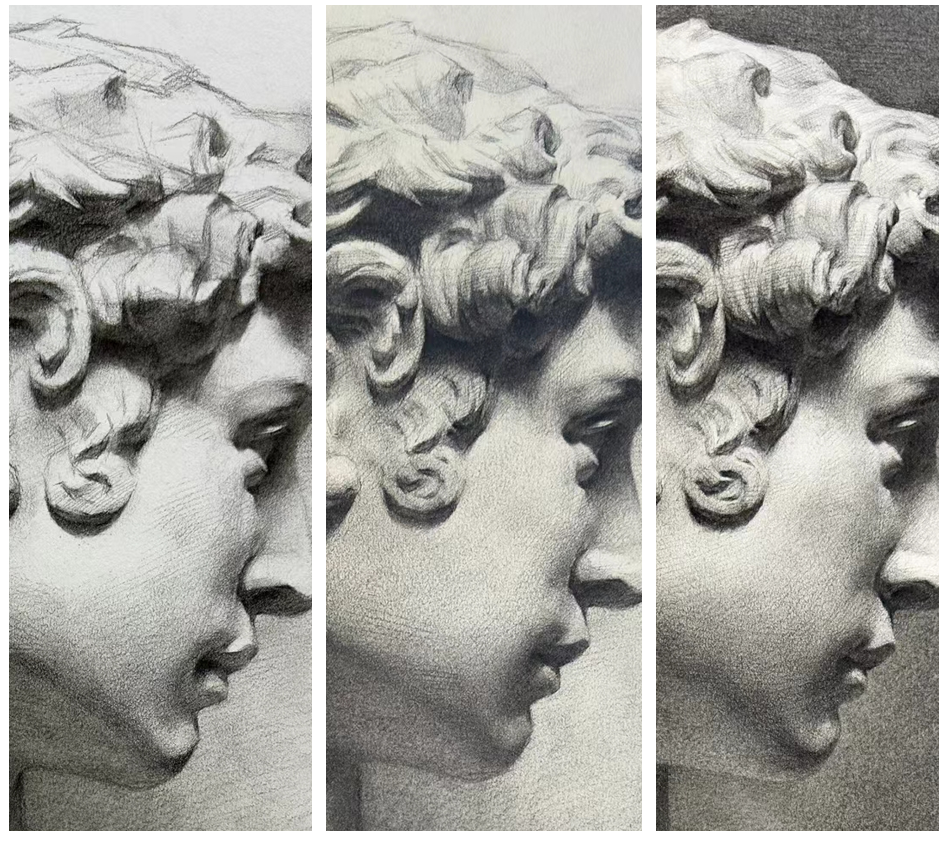 深入塑造是石膏像明暗素描的关键步骤,也是提升画面表现力的重要环节。石膏像的深入塑造,实质上就是在整体的基础上找变化,实现其丰富性。