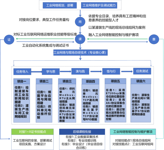 课程结构:选取灌装生产线的工作单元为任务载体,依据技能从项目中来,到项目中去的原则,任务的选取旨在完成每个工作单元设计、规划、部署、维护及调试,构建“灌装生产线供料单元基于Modbus RTU协议采集料仓温湿度数据”等6个学习项目。依据职业能力成长规律,每个项目构建2-3任务,课程结构如下图所示: