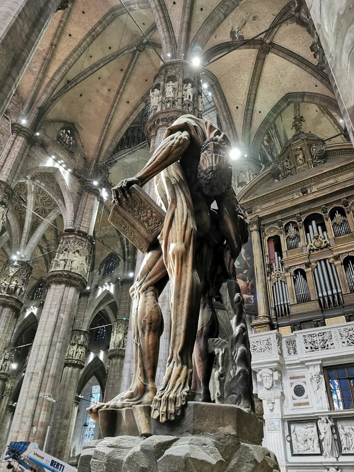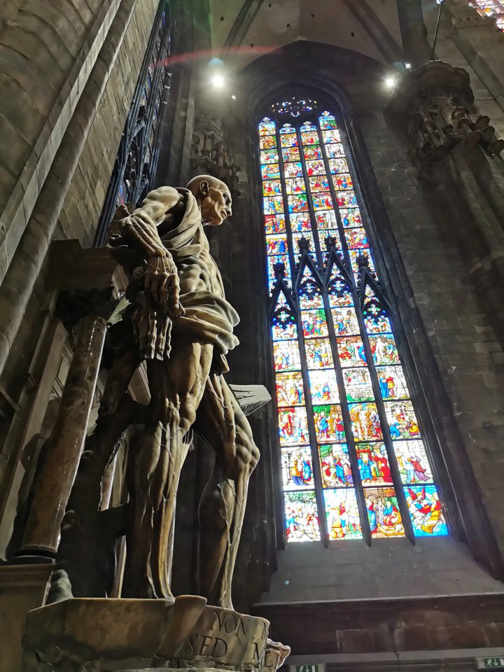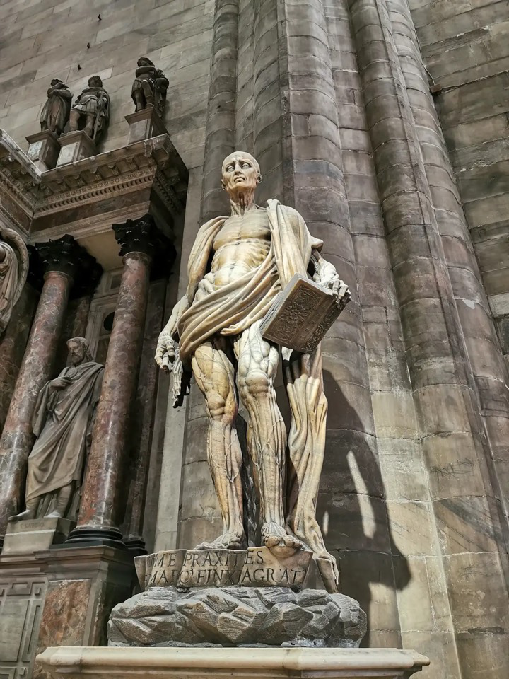米兰大教堂中著名的雕像,被剥皮的巴多罗买,巴多罗买是耶稣的门徒之一,在亚美尼亚殉教,被剥去全身的皮。