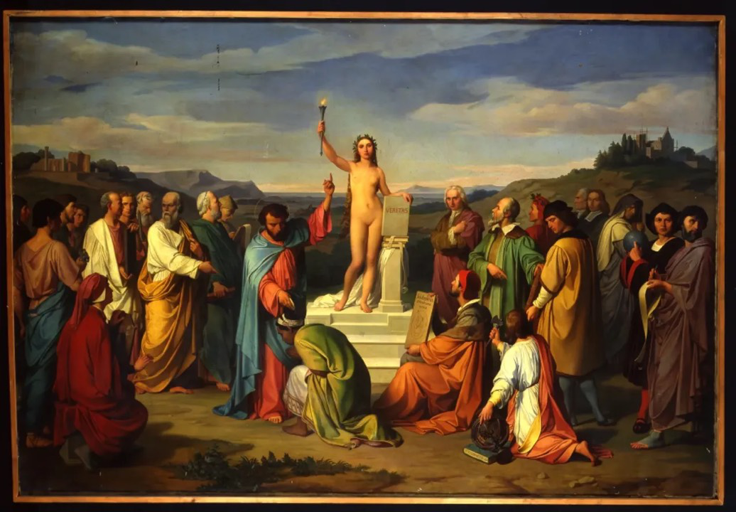 这幅寓言式的画作是1847年由自由派贵族菲利波·阿拉·庞宗(Filippo Ala Ponzone)委托创作的。它的内容是“那些为在世界上传播与错误和谎言作斗争的光明做出贡献的伟人”。