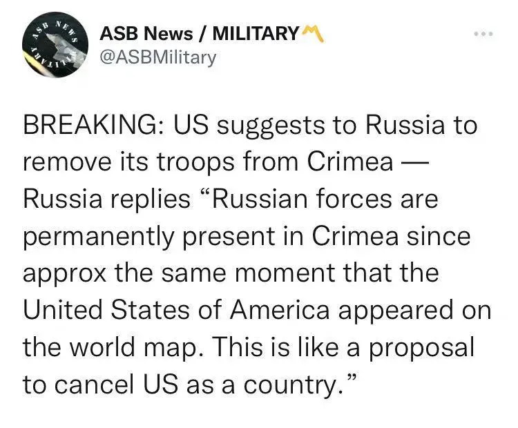 美国建议俄罗斯从克里米亚撤军——俄罗斯回复说:“自从美利坚出现在世界地图上的那一刻起,俄罗斯军队就一直驻扎在克里米亚。这就像取消美国作为一个国家的提议。”