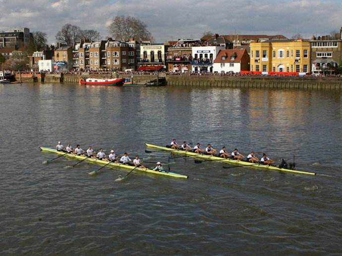3. Summer Eights is an annual series of rowing events over four days in which teams from different Colleges compete in races on the River Thames. An “eight” is rowing boat with eight oarsmen/women and a cox (who steers the boat). The best-known race is the Oxford versus Cambridge Boat Race on the River Thames. Members of the first teams for rowing and other sporting events between Oxford and Cambridge receive the sports honor of a blue(蓝色荣誉,因牛津和剑桥赛队的队服都为蓝色,牛津为深蓝,剑桥为浅蓝). Dark blue represents Oxford and light blue represents Cambridge.