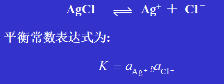 该平衡常数又可称为溶度积常数,用 Ksp 表示。由于难溶性强电解质的溶液都是极稀的溶液,可用浓度代替活度。故上述沉淀溶解平衡的Ksp 可以表示为: