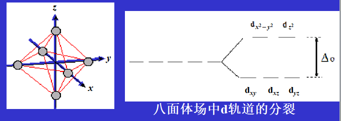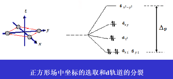 以球形场时5个简并的d轨道的能量为零点,讨论分裂后的 d 轨道的能量。电场对称性的改变不影响 d 轨道的总能量,d 轨道分裂后,总的能量仍与球形场的总能量一致,规定其为零。