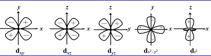 在自由原子或离子中,五种 d 轨道的能量简并,其原子轨道的角度分布如图