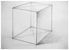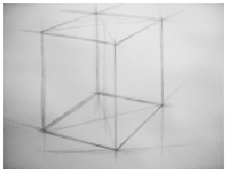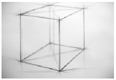 (3)、虚实刻画:立方体的形体准确后,根据立方体各条棱线和各点的前后空间位置关系,用粗壮、凝重的线条对它们进行虚实处理。具体要求是近实远虚。近处的点和线对比强烈,远处的点和线及内部的结构线对比弱,以增强形体的体积感和质量感。