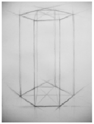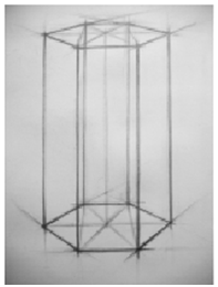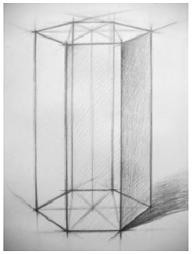 (3)虚实刻画:形体完成之后,进一步对六棱柱的各点、各条棱线按照近实远虚的基本规律进行虚实处理。表现出棱柱的空间体积。