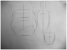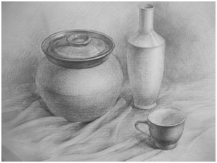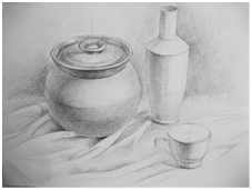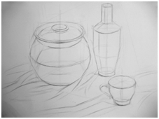 这组静物是由高低大小不同的三件瓷器组成,质地坚硬,颜色深浅不同,造型以曲线为主。根据构图的基本规律用较浅的长直线确定物体的整体空间位置和每个物体的形体轮廓。注意形体比例要准确