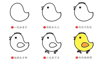 (3) 生动性,简笔画表现形象时,要生动活泼,以漫画的手法造型,夸张、变形、拟人借代,都是简笔画常用的形象语言和表现方式。