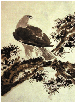 画松树的枝干,在设计这个枝干时,要根据鹰的姿态、神情和构图位置而定,这鹰整个身体趋向左方,而头是回向右方,整个位置是偏上左方,所以设计的枝干要有反向倾向,这种构图才能稳住整个画面。其用笔方法,从左下方以侧锋活墨起笔,逐渐变为中锋向右上方画出枝干。对初学者来说,先用点的方法比较合适,在枝干的四周随意点一些点,为画松针定一个初步位置,这一步是画好松的关键所在。画松针要在前面点的基础上,依点引线,将所有的松针画好后,再进行整体的审视,根据构图、虚实的需要进行添加,不断完善整幅画的艺术效果,这样就能很好地画好这幅作品