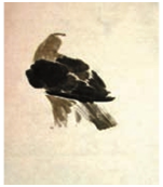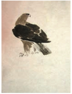 画鹰的脖子和大腿,画脖子时要注意用笔的精到,特别是画鹰的头顶这一笔,既要考虑头顶的结构,又要注意用笔的灵巧,更要照顾鹰的整体精神。而脖子的画法就较简单,只需用淡墨涂出大概脖子的造型即可。鹰的大腿用墨是关键,要求由淡的湿墨画到干墨,尽可能地表现出大腿边的轻细的羽毛。