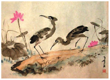 在整幅画的创作过程中,以情趣为主导,述说耐人寻味的故事,如两个鹭鸶之间要有一种有趣的呼应,画者可以运用拟人的方法,赋予一种情感的成分,让其自由地进行交流,同时配上一些背景,使画面产生一种声色俱现的美妙意境。