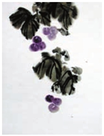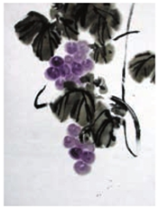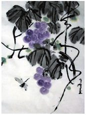 在完成的葡萄和叶子所结成的块面后,用藤条进行串连,这种串连可以用数字画藤的方法,将几个块面有机地贯穿于一体。一般的情况是先画一个作为主藤的变形的8字,这个数字要按8字感觉画,画出后要看不出有数字8字的形来,其整个数字的线条犹如虬蛇在大小叶子中跳动,使之产生一种有趣的节奏感。
