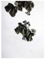 画葡萄先以大笔墨画出葡萄的叶子,先画3~5片叶子,在画面上定位。在这比较少的叶子的布局中,要考虑其有聚有散的整体构图关系。在墨迹还未干时,用枯墨干笔,快速勾画叶脉。
