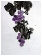 接着用比较淡的紫色(在原来的紫色中加点水),画在前面三个一组“立位”时的空隙之中。可以是三个一组,也可以是单个添补,逐渐组成一串自然的葡萄,在添补的过程中,不管原来的空间有多大,后画的葡萄的大小基本不变,再小的地方也得画上这一标准的葡萄,因为宣纸的功能可以自然产生前后效果,不必刻意去表现。