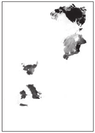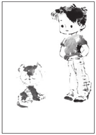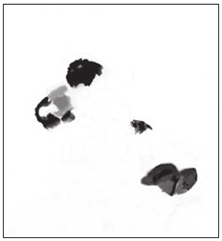 1.先用碳条轻轻地画好整幅的造型,将完整的故事全部画好后,最后才能动笔墨,先用活墨侧锋把两个小孩的头发、衣裤所呈现的墨团画出来,这几笔是定位之笔,用笔要稳和准,既表现结构,又呈现笔墨,浓淡墨匹配要适当。