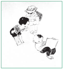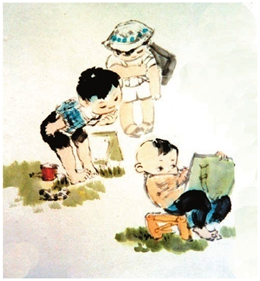3.最后审视整个画面的构图效果,作一些添加和点缀处理,如前面小孩所坐的小凳子,点下巴小孩旁边的画夹以及小草等东西。接着上色,除了用朱磦和三绿色调成的嫩肉色涂小孩脸部是一样的,衣服、道具等物都要进行有意识的色彩安排,总之要使整幅画面呈现出一种带有故事情节的生动活泼的童趣韵味。