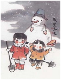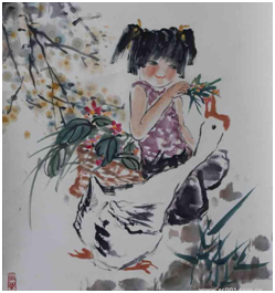 2.中国画讲究“勾茎见分晓”,线条是塑造人物的关键。在这个小孩的刻画上,既需要有比较严格的造型,又要有适当的夸张成分,五官的表现有所变化,眼睛用圆点表示、嘴巴用短线表示、鼻子只用了一根简单的鼻梁线等,简略而概括地表达了这个小孩的可爱。