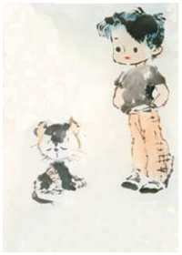 1.中国的写意人物和画山水、花鸟有所不同,有着相对严谨的造型。如果要变形也有一定的法度,其结构、比例是不能过分的夸张,所以画人物之前可以先在画底打好完整的造型底稿,然后再进行笔墨表现。这个小孩和猫的形象在打好底稿的情况下,先用大笔活墨,将小孩的头发、衣服和猫的头顶及四肢的大块墨团表现出来,要求在灵活多变的笔墨中,准确把握造型结构,做到笔笔到位。