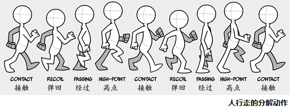 角色的各种动作(如行走、奔跑、跳跃等等)都有自身的规律在其中,在制作动画描述这些动作时,必须遵循其自身的规律。如下图以分解的方式描述了狗奔跑时的动作,和以分解的方式描述了人行走时的动作。