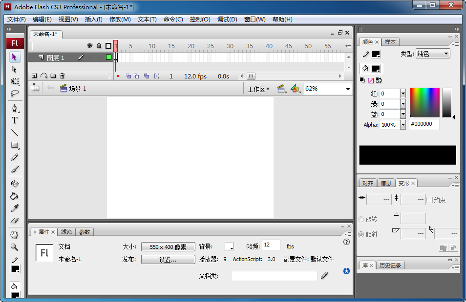 Flash CS3启动后新建一个Flash文档,即可进入Flash CS3的工作窗口,如图所示:
