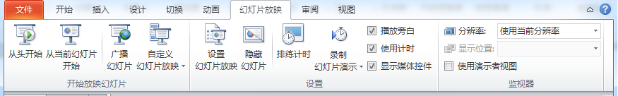 做好放映前的准备工作,可以进行放映,“开始放映幻灯片”组中有4种放映方式可供选择,如图所示: