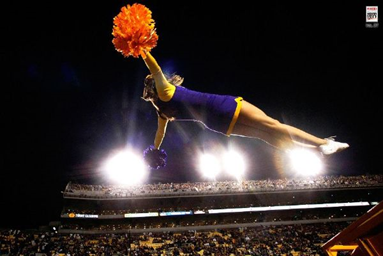 图10为当地时间2011年11月12日,美国加州,NCAA美国大学橄榄球赛,洛杉矶大学的一名拉拉队员被抛掷到空中进行抛接动作。
