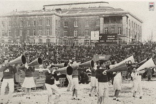 到了19世纪60年代,大不列颠帝国的学子们开始在竞技体育赛事中欢呼助威,随后不久这一形式就传到了美国。美国青年中只有百分之二的人才能进入大学深造,这些学生几乎都是男性白种人,主要是英国后裔。在课堂外,学生发展自己的社交和娱乐活动,热衷于学院间的棒球和橄榄球竞赛。每当有球赛,热情的男学生们就会来到赛场边,为自己喜爱的参赛队伍呐喊助威。刚开始,只是偶尔会有年轻小伙子从人群中站出来并为同伴呐喊。随着体育竞赛组织的日益严密,有组织的助威便逐渐成为一种加强观众参与的活动。有组织的呐喊助威与赛场上比赛的系统化相对应,取胜的强烈愿望也同样体现在“狂热的观众”身上,他们通过欢呼助威激励本队队员,并给对手造成压力。19世纪70年代,学生是校际竞赛的组织者,建立队伍并制定规则,比赛也加强了规则的统一性。随着大学男生数量及学生兴趣的增加,高校体育运动吸引了大批观众,他们主要是把体育运动当作自身消遣的男大学生。早期的赛场座位很少或是没有座位,观众则站会有年轻小伙子从人群中站出为男同伴呐喊。早期的赛场座位很少或是没有座位,观众则站在靠近竞赛区的比赛场地四周。随着参与人数的增加,才修建了许多大型体育场。
