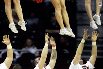 图11为当地时间2011年3月10日,NCAA美国大学篮球联赛,男拉拉队员把上层的拉拉队员抛起进行表演,抛接动作是拉拉队表演中风险最大的。