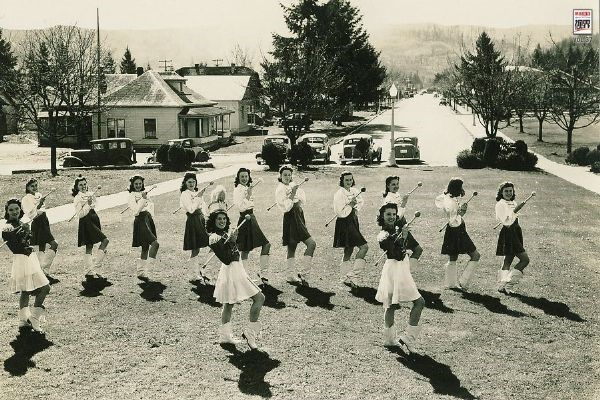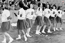 图3为40年代初啦啦队员身穿仪仗队服装搭配彩棒等道具进行啦啦队演出