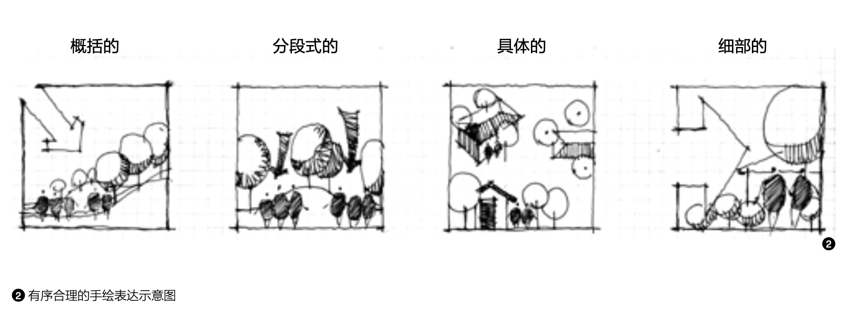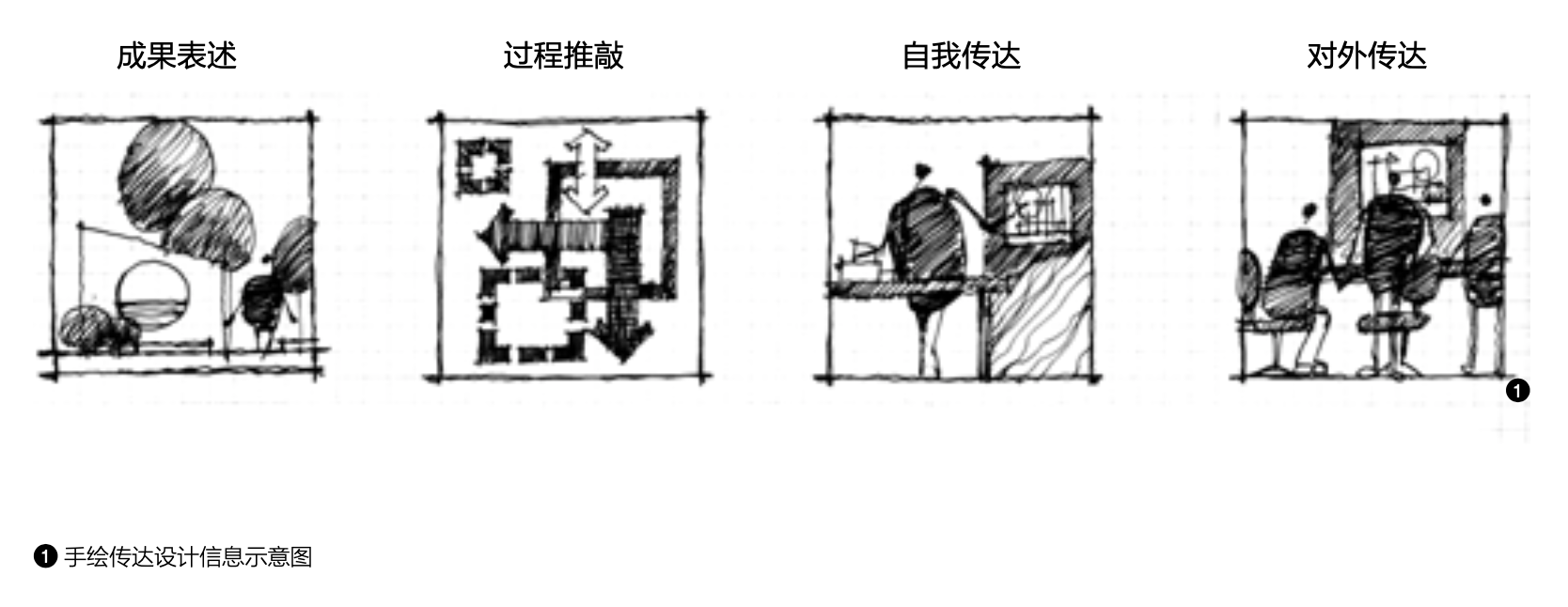 这种通过手绘的设计表述与传达含有两个层面的意义,一方面是帮助设计师进行自我设计观点的转述,另一方面是通过这种方式将设计构思与内容进行对外传达。设计师通过手绘图进行设计观点的表述是一种最直接快速的方法,它可以在最短的时间内对设计师的构想进行初步的研判,以利于在合理的时间内获取一个更为正确的设计答案,而这一答案和研判方式是综合了诸多专业性观点综合所起到的作用效果。对外传达在整个设计决策中亦是绝不可少的,它是将我们的设计构思向老师或同学甚至业主传达的一个方式,我们通过这样的手绘表达来供他人评估以及沟通。