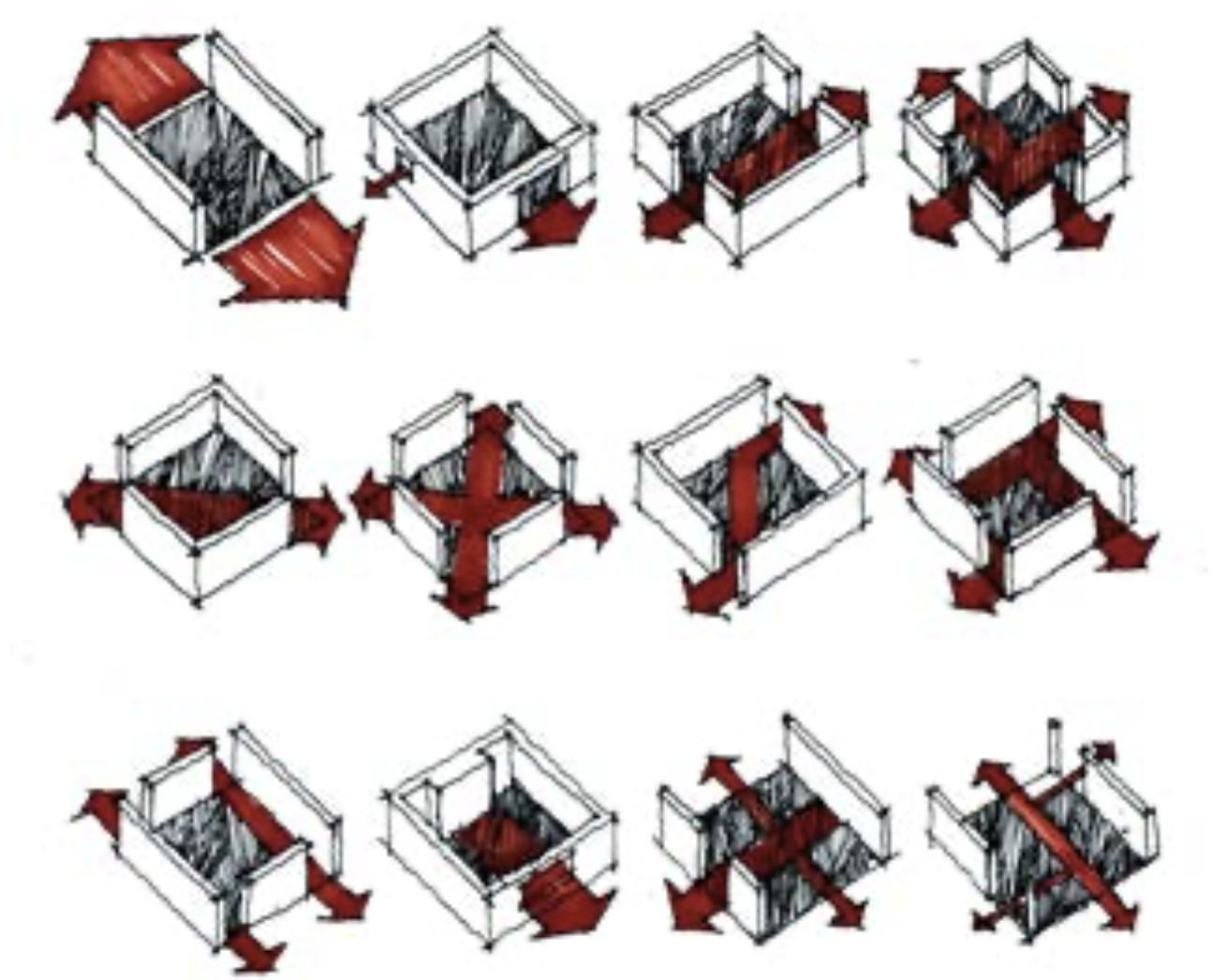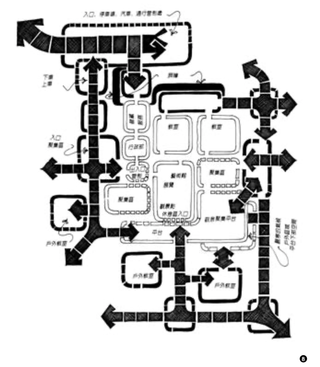 如此,我们在设计过程中总是 以利用简单的图示进行设计语言的描述,而图示可以是一个非常简单的符号,单单以箭头作为符号即可对许多概念内容进行叙述了。如采光方向的说明,可以用箭头符号说明采光照入室内的方向;又如气流与室内的关系的说明,可以用箭头在平面上面示意说明气流的动向;再有视觉视线的说明也同样可以利用箭头为图例,从视点向外指引示意......等等,利用图示说明可以让设计的说明内容变得生动而有趣。