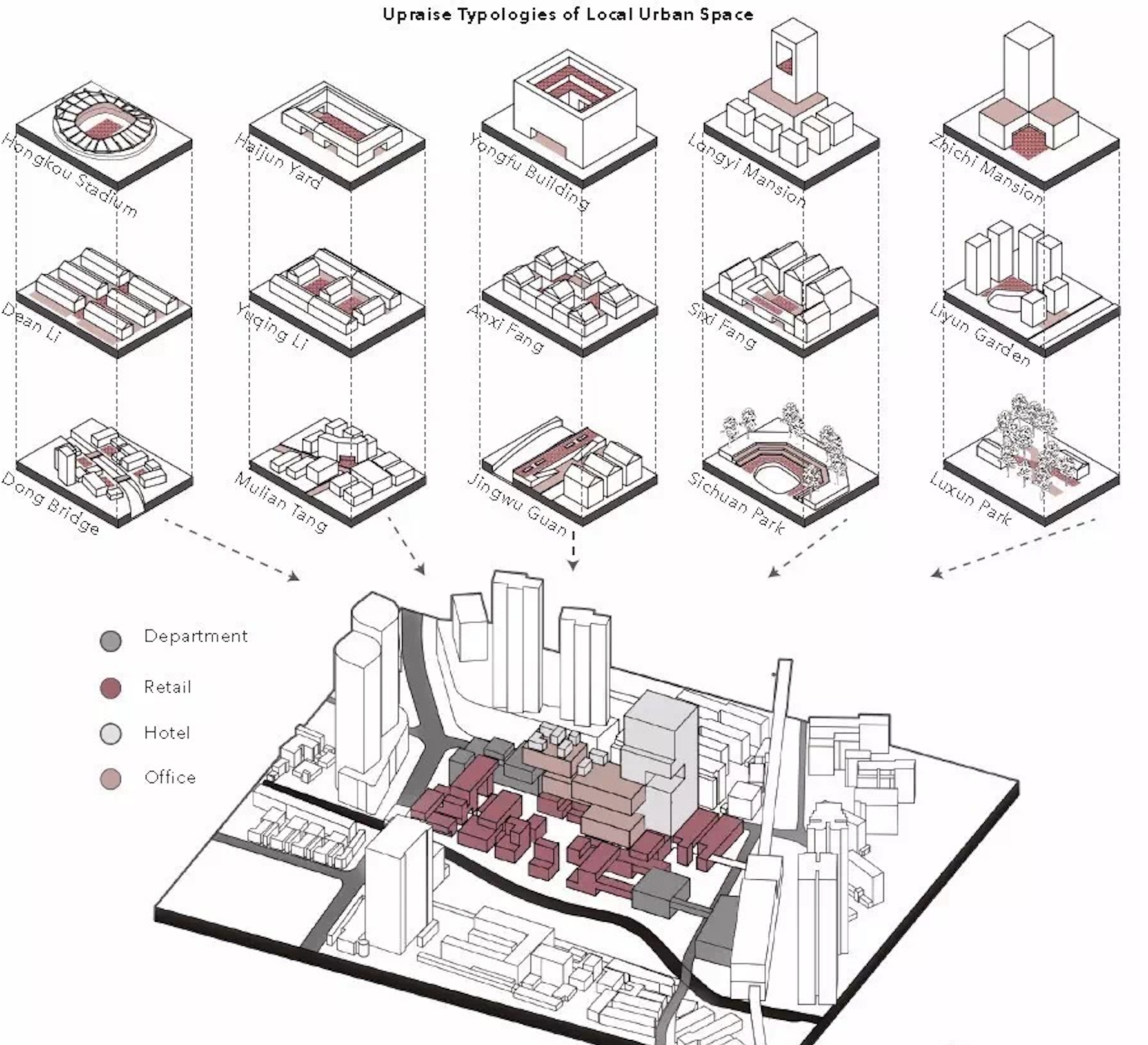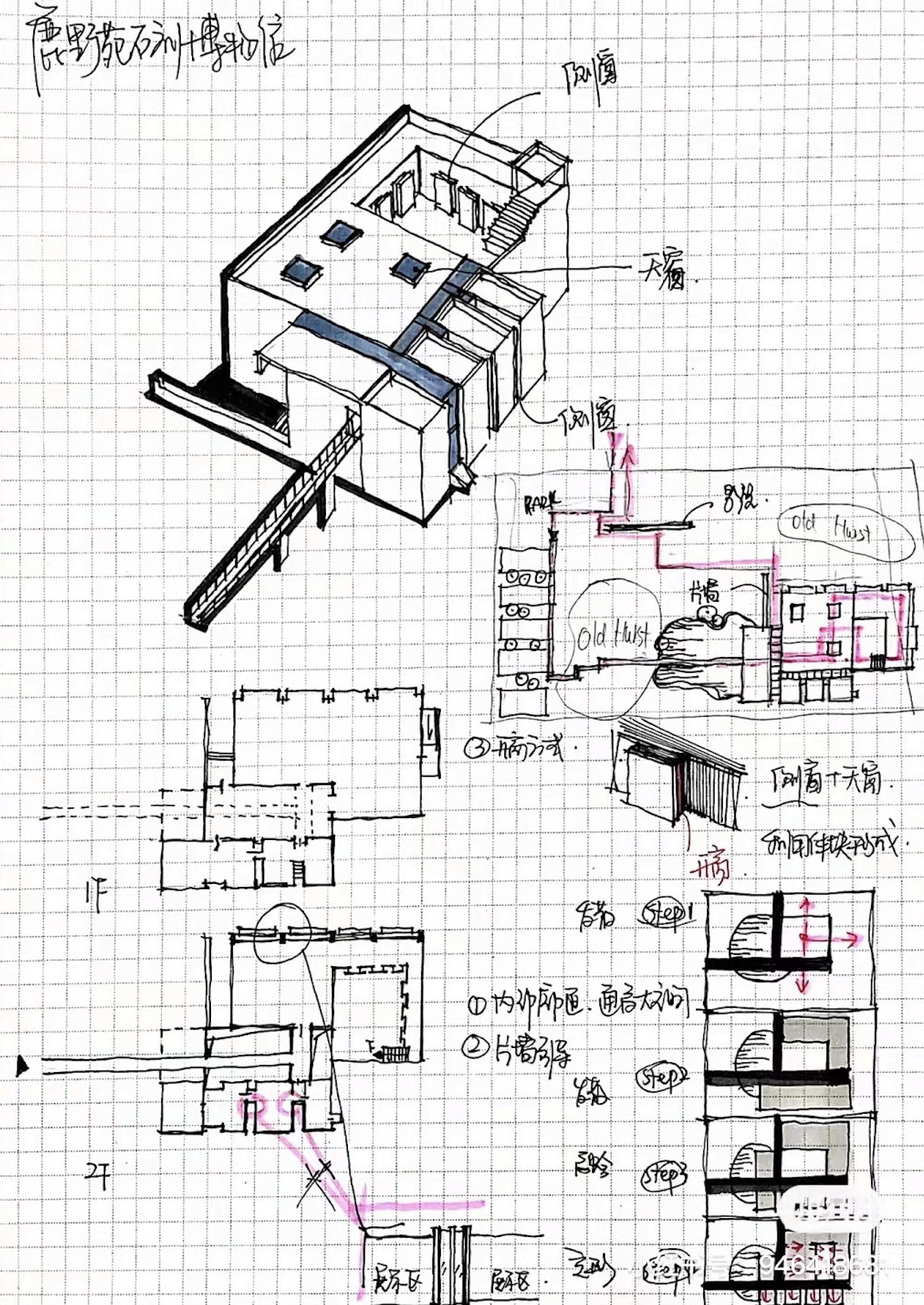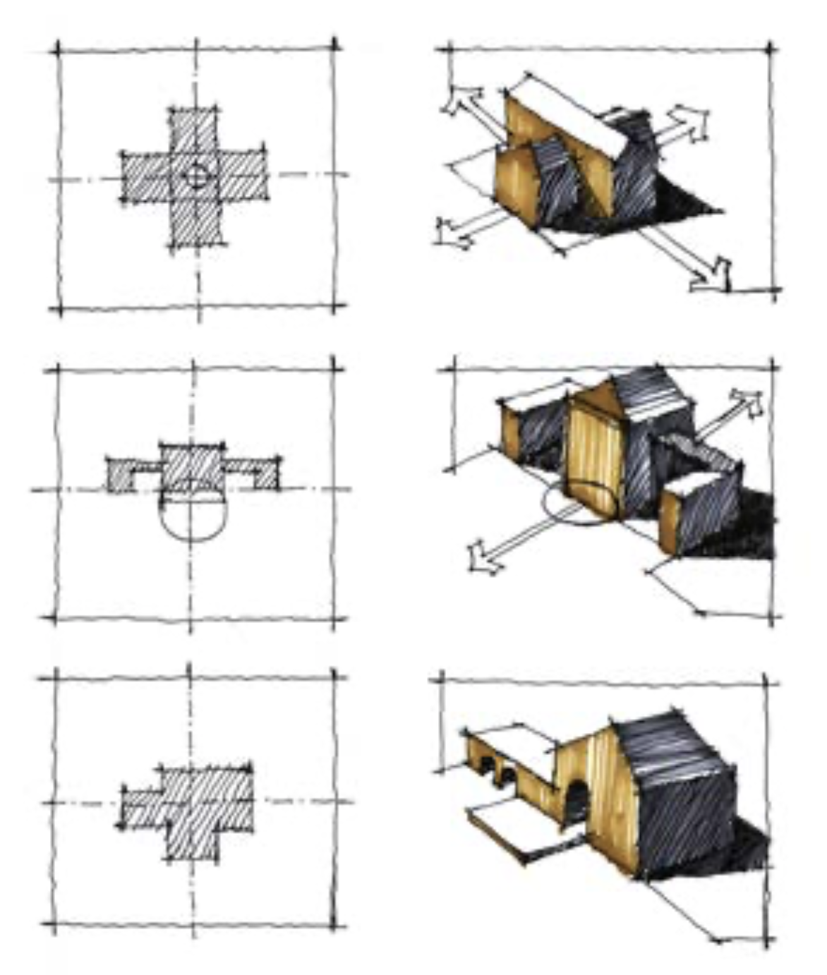 许多开始初学设计的同学,在看到精彩的设计效果图时常常心存敬意,甚至会误以为设计稿是从一开始就已经是精彩入微了,其实不然,严谨的设计方案通 常是从设计概念示意图开始的,是设计者在概念示意图的基础上经由苦心经营才 慢慢的展现出设计方案最终的精彩效果的。做设计方案就如同书写,它需要有中心内容和大纲,需要有关键词也应该具备修饰性的词语,概念示意图能够帮助设 计者将设计的中心内容梳理清晰以利于后续的深入设计。设想一个设计方案的展开之初,它可能是呈树状发展的,设计的初衷可能是始于某一个清晰的点,但在 它“生长”的过程中它可以有多变的外观、结构以及设计逻辑上的各种信息...... 因而设计的构思过程是有多重思路的,我们可以利用简单的概念示意图进行反复推敲,强化设计概念的逻辑性。