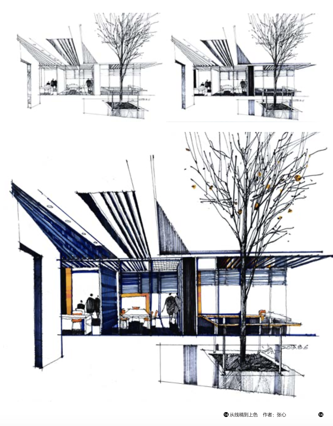 通常会用提白笔和修正液来修饰物体的高光部分或者修饰明暗交界处,一般用在整个作品基本完成之后,起到点睛的作用。经常会用到的地方有建筑外立面、玻璃,植物也会少量用到。