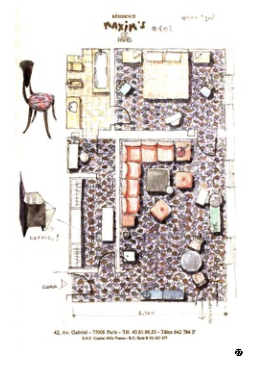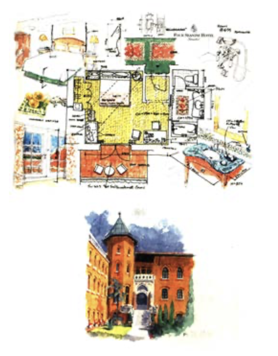 例如日本知名建筑师、室内设计师浦一也在各地世界旅行中,他就有一个和好的专业习惯,他每到一处都会用纸笔把不同旅店的平面图描绘下来。在绘图的过程中作者对空间的色彩进行记录,将酒店空间中一些细致的色彩关系描绘下来,这便是一种空间色彩学习的方法。对空间中的每一个物件进行记录,从材质到结构以及摆设的方式,这比一般的拍照考察要更为深刻,能够帮助我们对空间中各种尺度关系的认知。虽然每次都要花费不少的时间, 但是浦一也觉得,对于他而言,探险就是对客房进行测量及描绘,这样的一个记录的举措不但能够深入的理解不同酒店空间的不同,而且还能在看到图纸的一刹那勾起旅行中对于某种主题空间的独特记忆。作者通过对酒店空间的平面制图来了解所到酒店的空间布局。这是设 计信息获取的一种有效的方式,在绘图的过程中作者不断的获取各种信息, 例如家具的尺寸,空间的尺度,房间的整体格局等等......绘图是一种设计学习过程的记录。