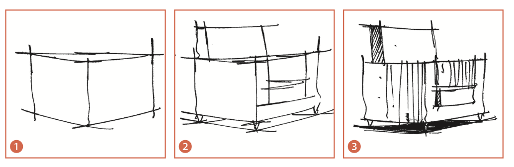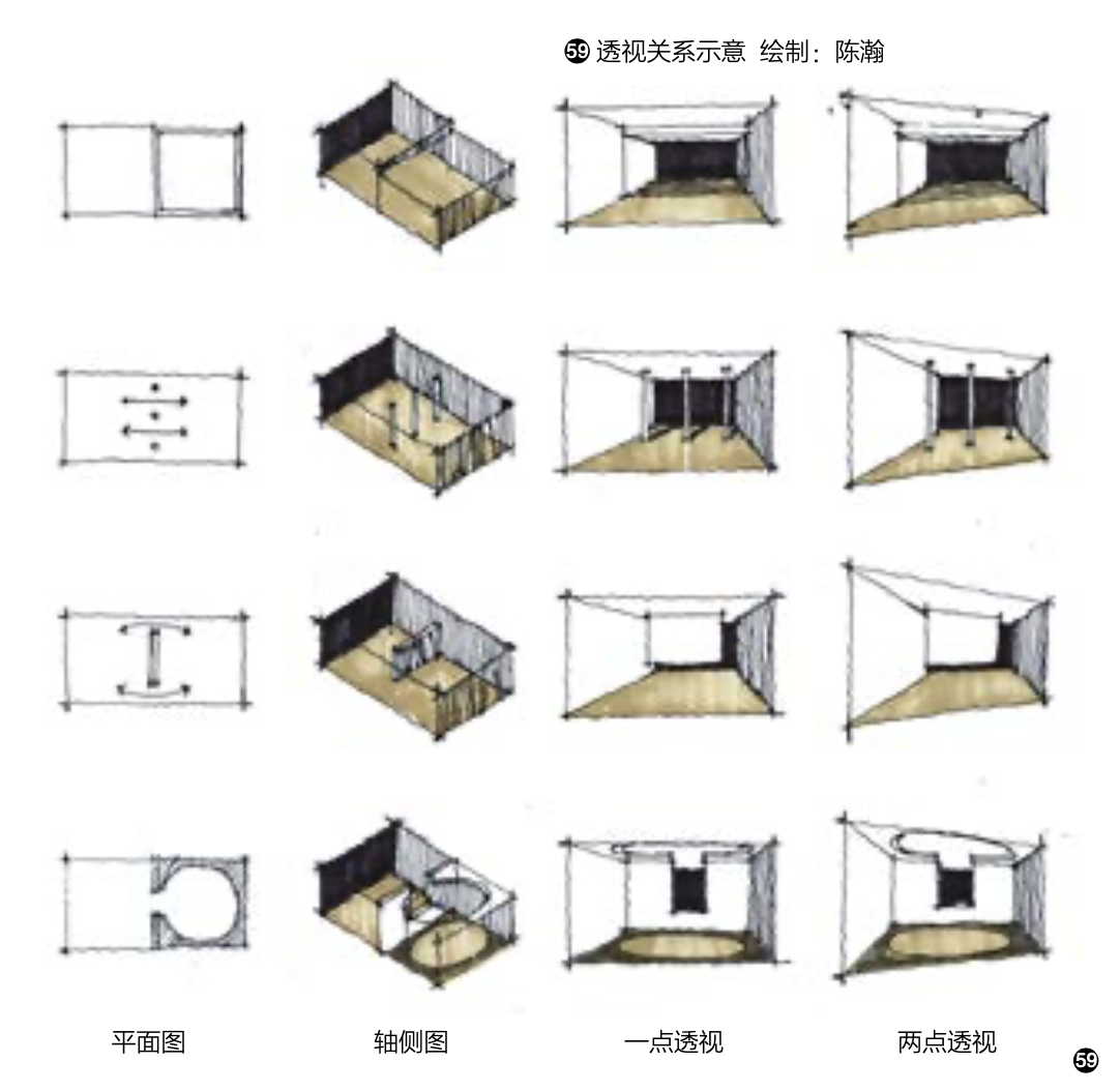 透视是手绘的基础,只有正确的 理解空间的透视关系才能够清晰的表达空间的结构,透视常常是手绘学习 中较难掌握的部分,都是最为关键的 部分,对透视原理的掌握就等同于抓住了空间手绘的“灵魂”。初步入门 阶段,对透视的掌握可以从单体物体 的临摹或写生来学习基础的透视原理。 但即使在临摹阶段也要清晰的掌握透视的基本原理,只有从单体开始严谨的进行透视的计算才能够帮助我们进 一步的掌握空间的透视关系。在一定 时间的单体练习之后再转入对完整空间的透视联系,这跟手绘的学习步骤 是一致的,都是由浅入深的过程。