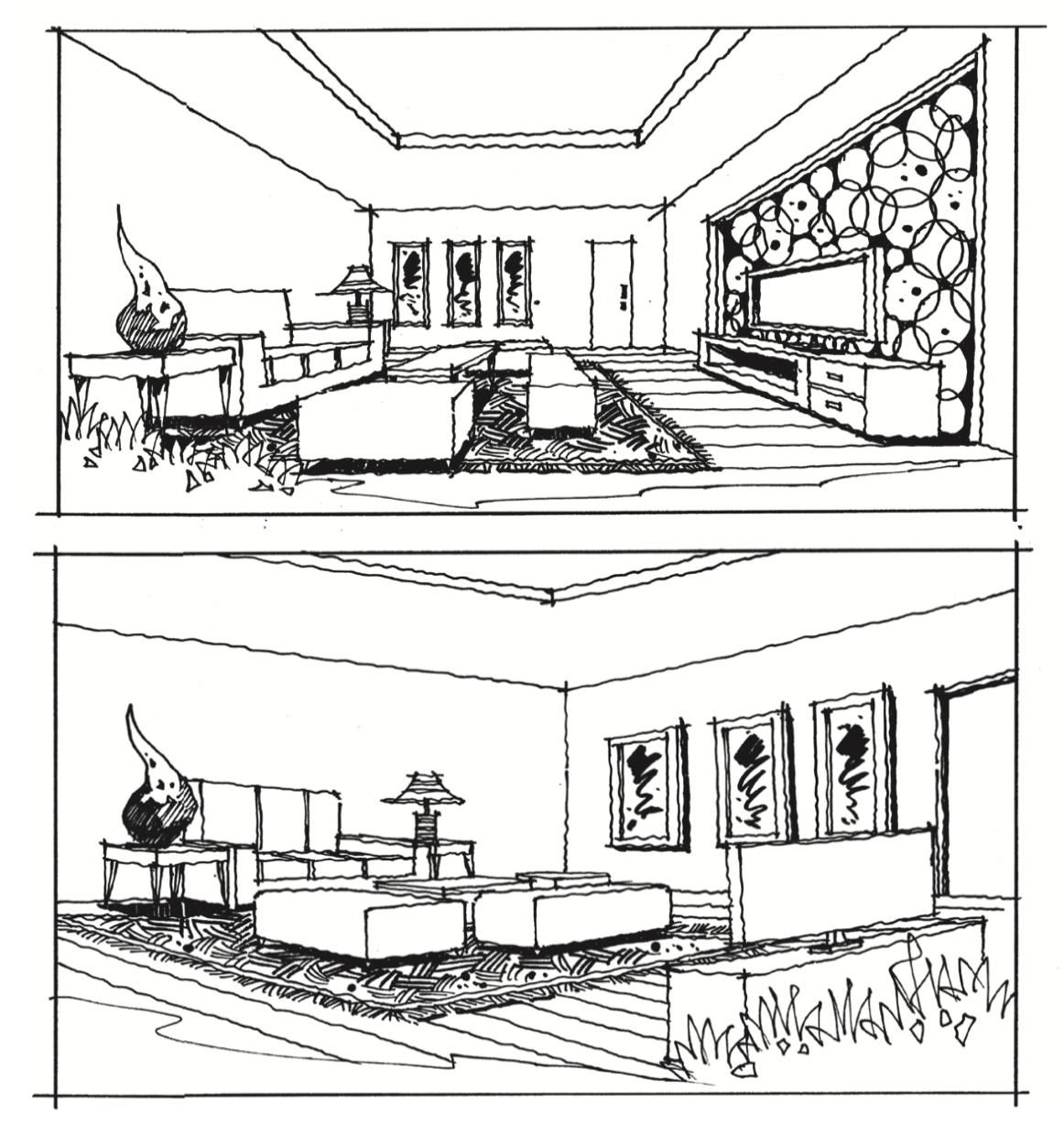 首先我们可以将所有的物体概括成简单的几何形态,通过简单几何形体的透视来理解和掌握复杂物体及空间的透视关系。先从几何形体入手掌握透视,就如我们在学习素描时,先要掌握几何体结构描绘一样,几何体是任何物体的基本 框架,掌握了几何框架,才能够掌握复杂物体的描绘。所以入门的单体联系我们可以选择较为简单的几何形体来进行练习。对几何体透视的了解可以帮助我们更准确的找到物体的透视框架,特别是单体的绘制,而空间更是一个放大的几何体,只是我们开始进入了几何体的内部。我们同样可以用几何体的基础物理结构来理解透视的基本关系,而进入到空间我们不仅要掌握简单的透视原理,我们还需掌握视点、视角、视高等等影响视觉变化的一些透视术语。