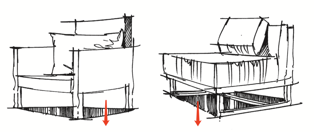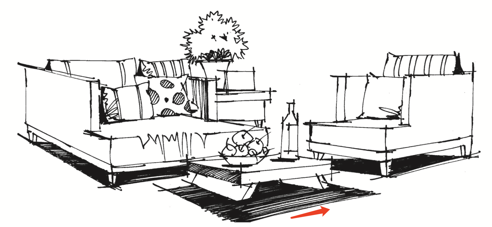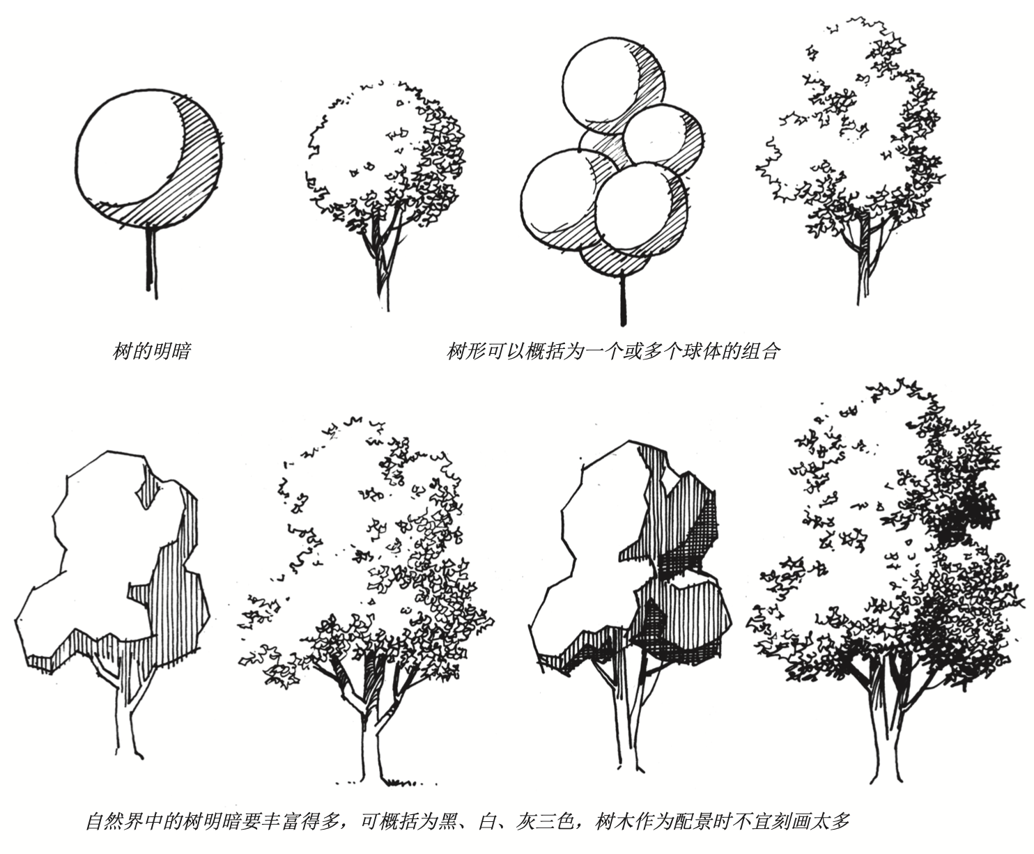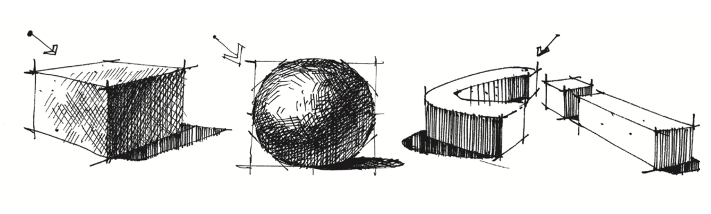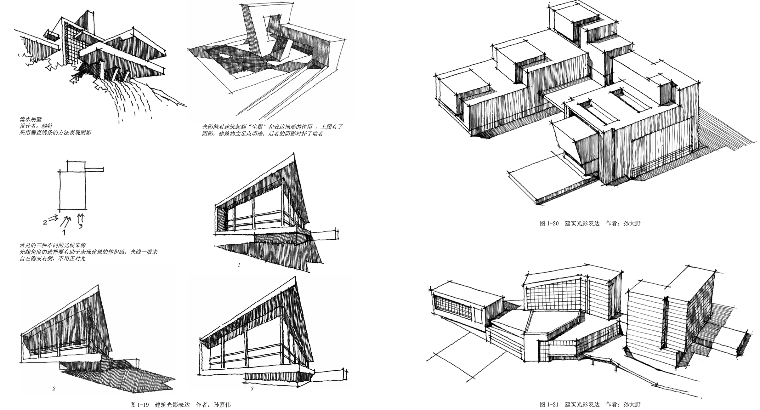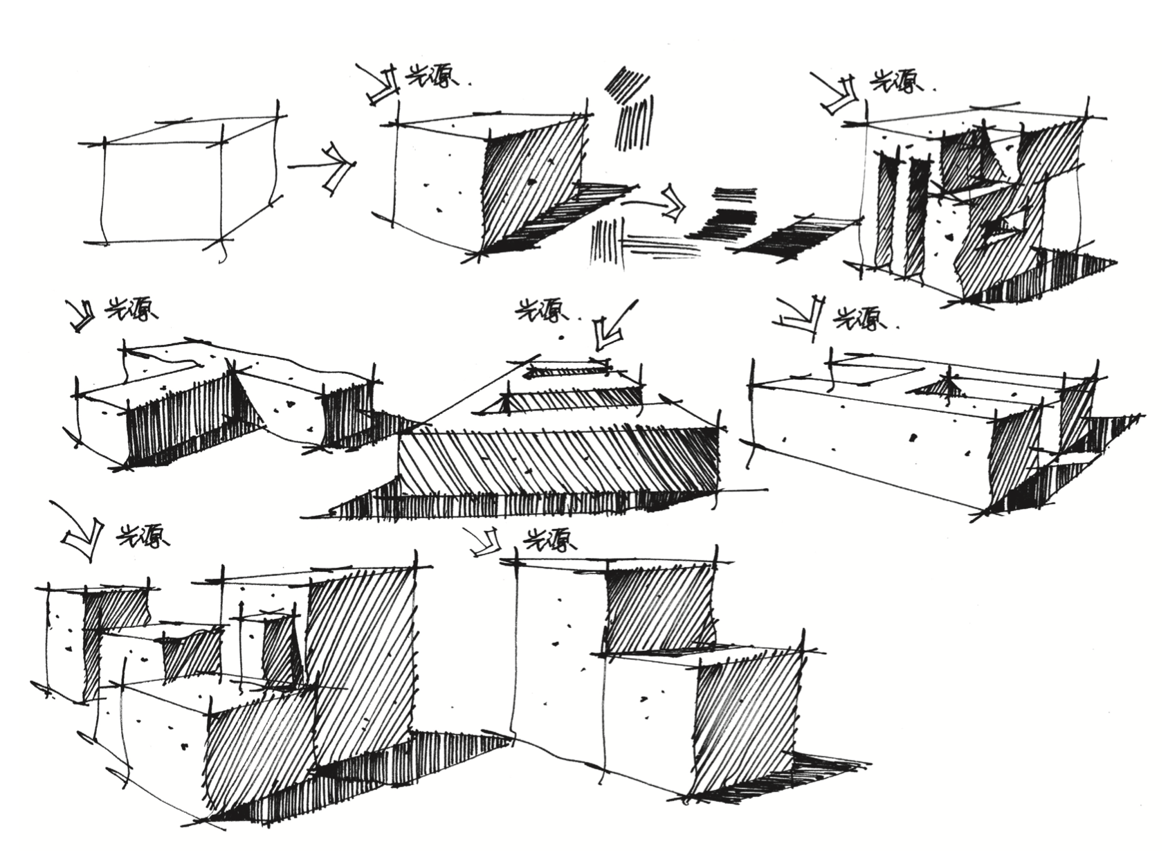 物体的明暗关系在前面的章节中已有了初步的说明,前面我们提到在手绘中物体的调子关系通常分为三大块,暗部、 灰面和受光的亮面。通常受光面以留白处理,所以在进行调子上色时我们通常只上灰面和暗部两个调子,而另外一种更为概括的表达方式是将物体的调子省略为两个关系,及明和暗的关系,暗部分的关系含括了灰面和暗面,既将灰面和暗面一起概括为暗部。调子随光影而来,而空间或建筑等物件的光影通常都分为两大类型,一类是由室外的自然光,另一 类是室内的灯光照明。而光影对物体的投照所产生的投影实际上非常微弱,即使是较强的光影也需要仔细观察才能发现,那么我们进行手绘时的影子和暗部关系多数是需要通过设计师进行概括后整理出来的。投影与暗部的关系是紧紧相随的, 所以只要我们能够准确的将投影的角度找出来,暗部的轮廓便随手可得了,当然,我们也可以先从暗部轮廓来找寻投影,它们的因果关系是相同的。