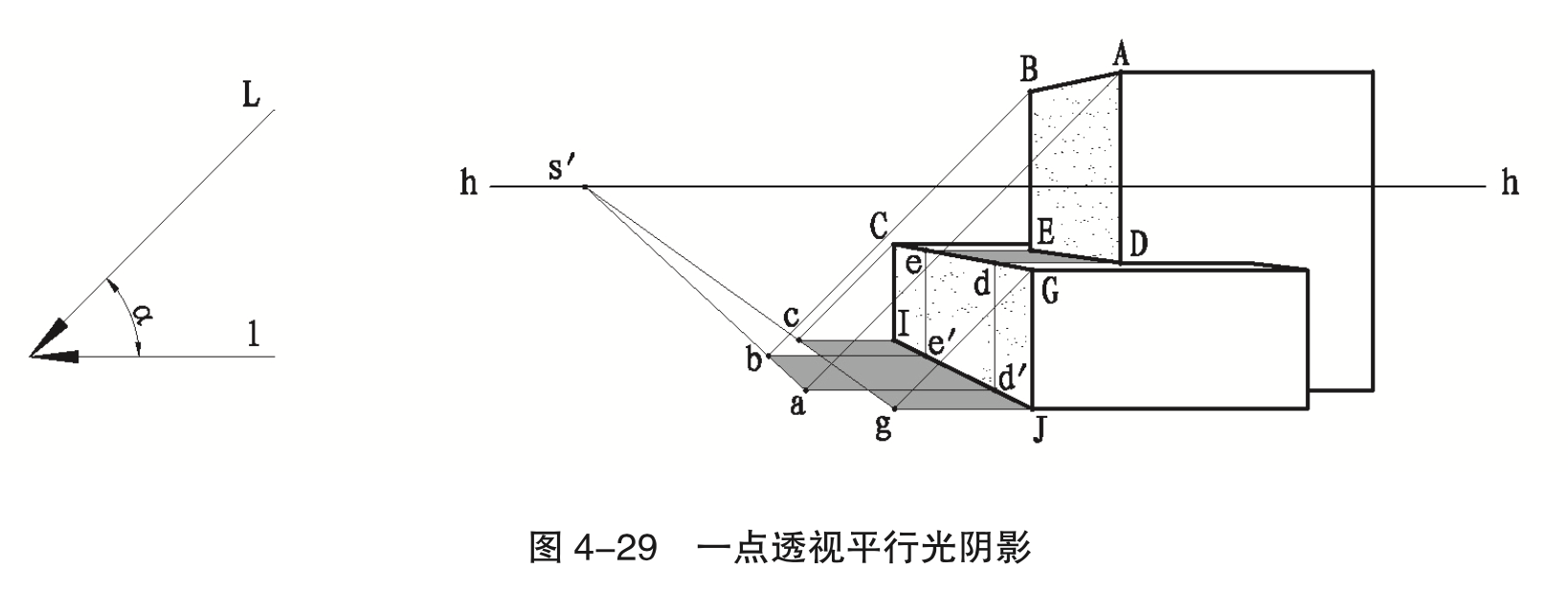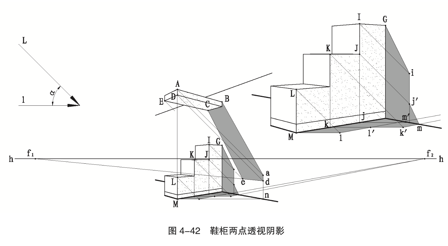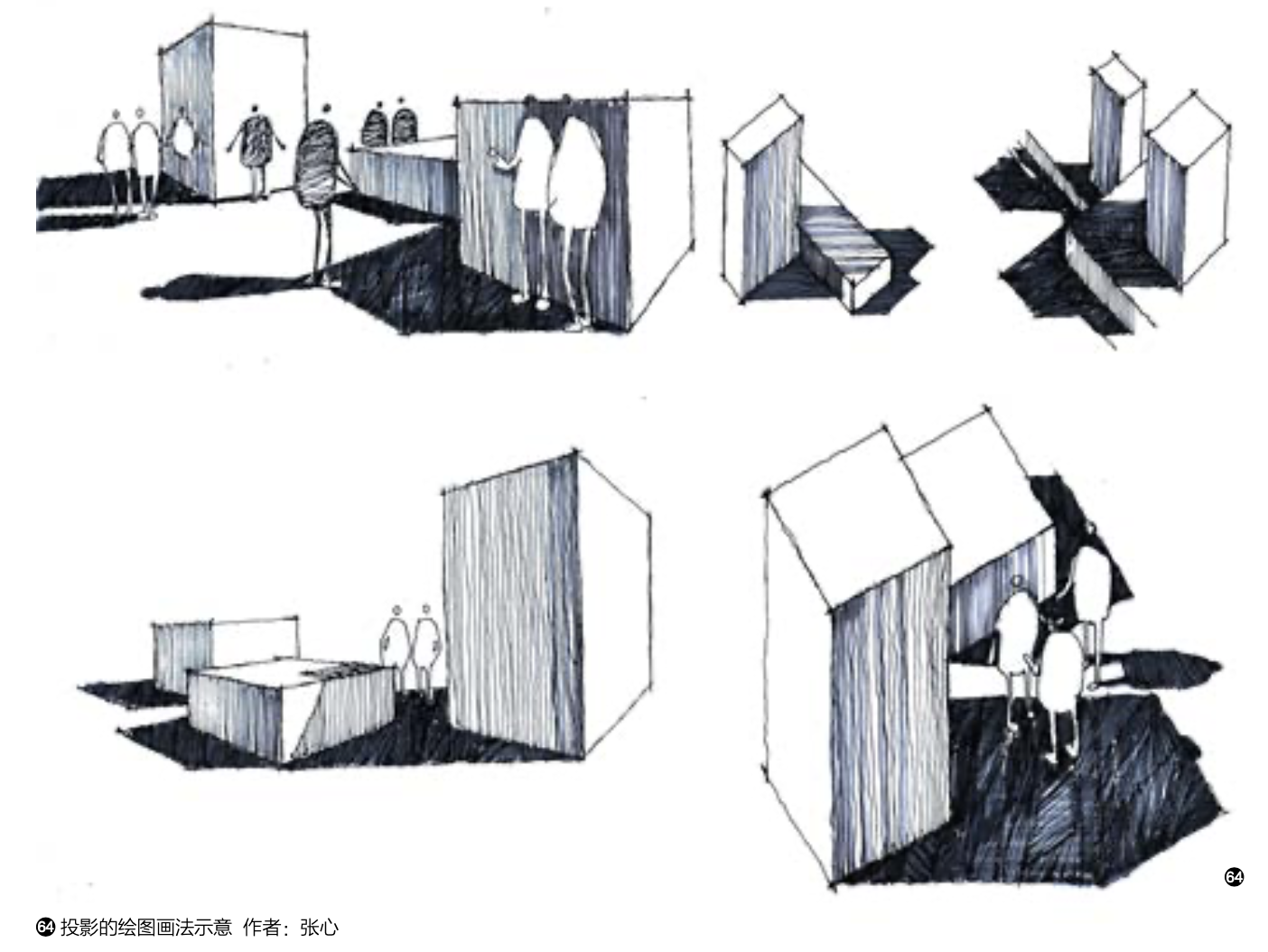 这里我们简单的介绍常用的投影画法要的一些方法。首先,正确的投影画法是必须建立对于物体准确的投影位置的 了解,在室外无聊是在那一个季节,哪一天的哪一个时刻;在室内是聚光灯或射灯或泛光灯等等......这些信息都是非常重要的设计资料,根据这些资料信息我们就可以推演出一个图像中物体的轮廓模样了。其次,我们不管描绘空间中的任何物体都可以利用加重投影来强调物体的品质,养成习惯性的为每一个物体绘制投影,勤加练习对光和影的触觉就会越来越敏感了。带着对光影的感觉,我们可以掌握一些简易的方法,如将影子的角度定在离物体 30 度、45 度或 60 度等的常用角度,在一个空间里物体的投影角度都有了统一的角度,这样绘制起来就较容易了。我们会发现空间中的光影常常不明显,难以观察,所以通常物体投影的准确度并非绘图内容的重要因素,这时,投影的绘制还有一种非常好的方法。 这种方法假设物体投影的方位及角度均为一个常数,即 45 度,45 度的角度主要是因以美学上的构想为主而被认同,同时也是最简便、最快速度的物影画法。