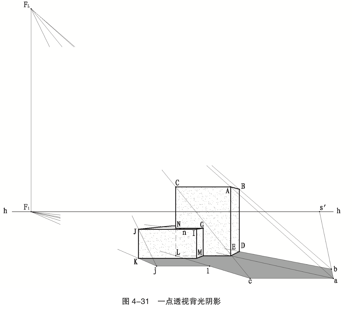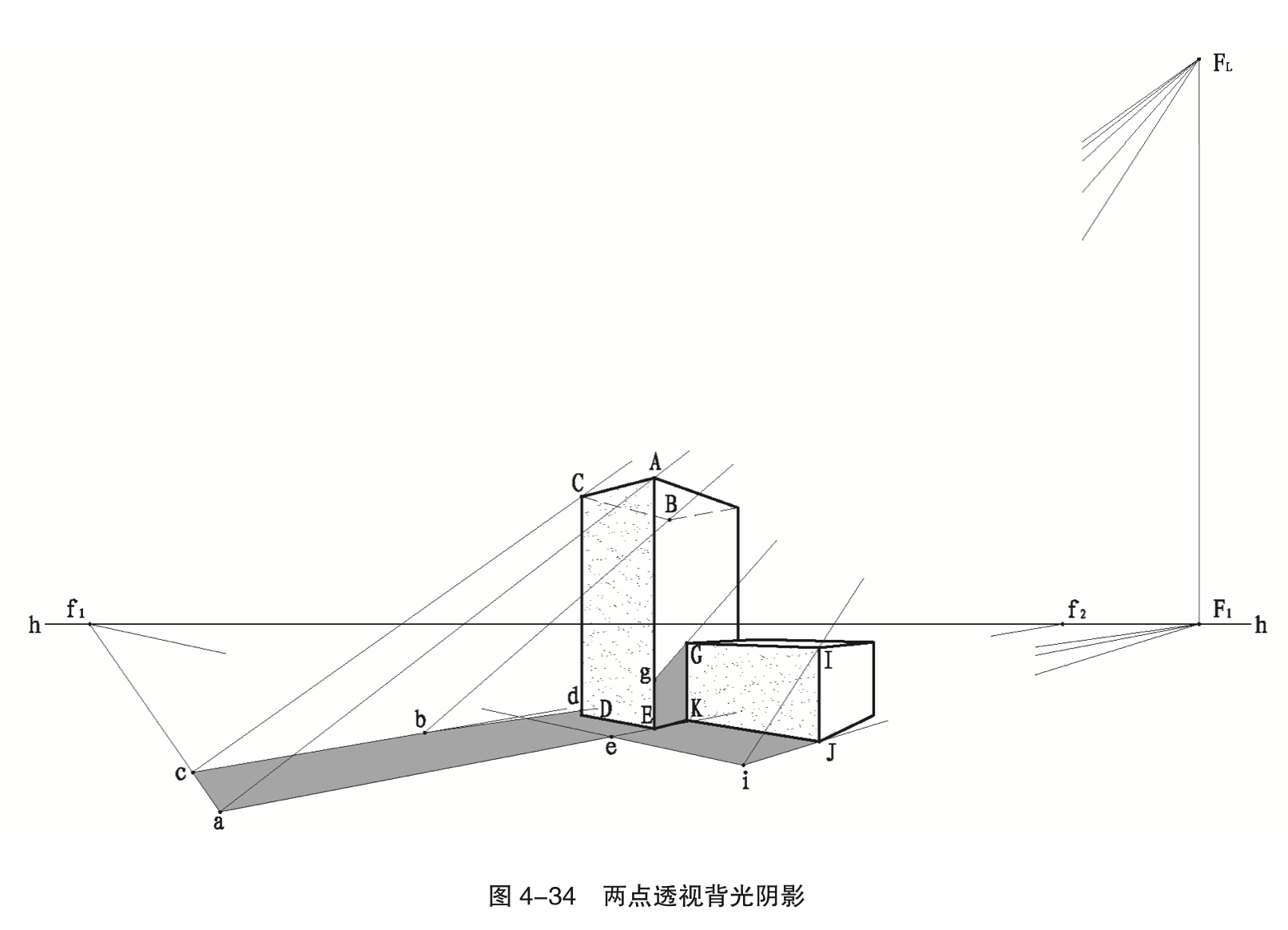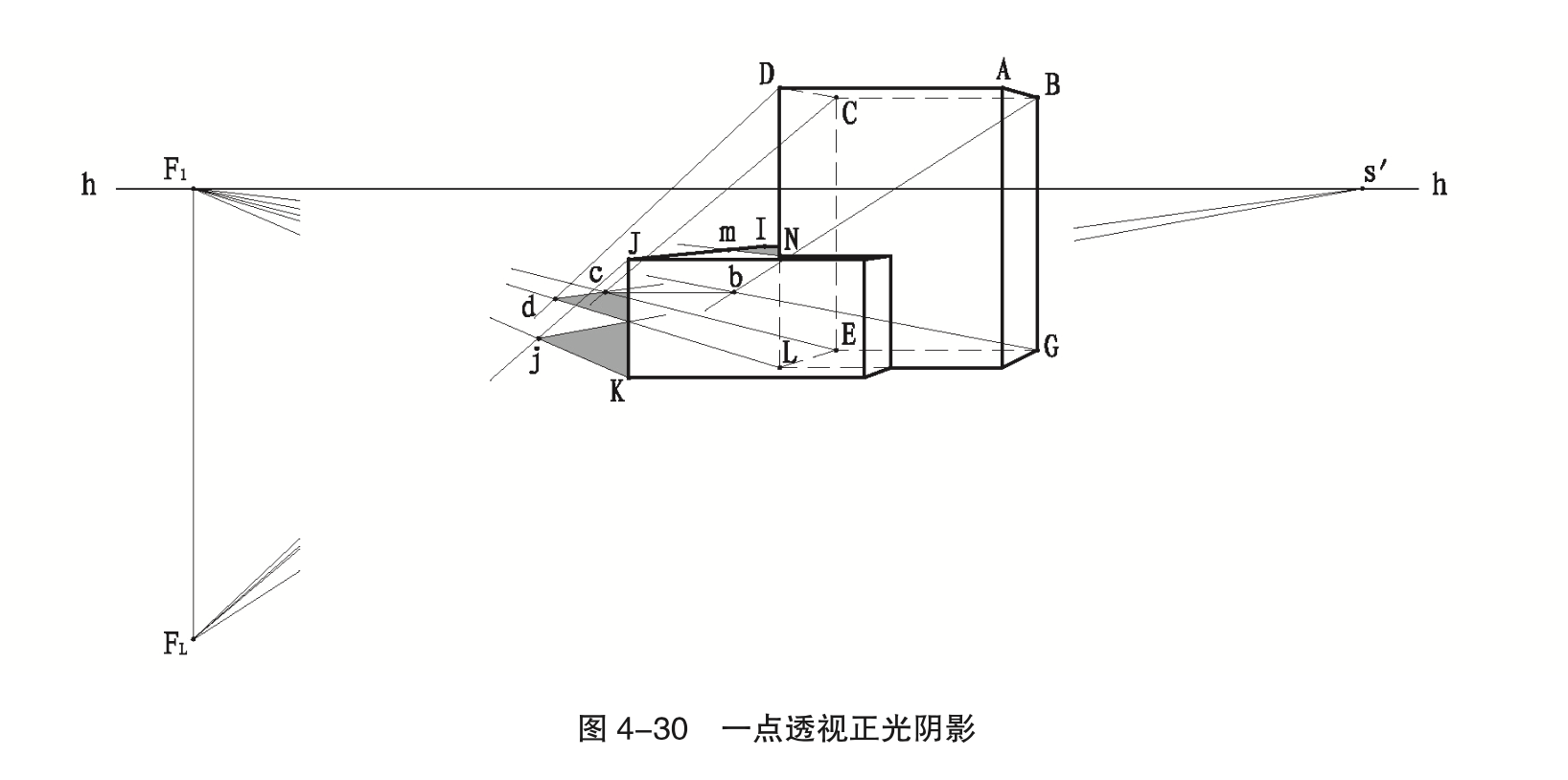 这里我们简单的介绍常用的投影画法要的一些方法。首先,正确的投影画法是必须建立对于物体准确的投影位置的 了解,在室外无聊是在那一个季节,哪一天的哪一个时刻;在室内是聚光灯或射灯或泛光灯等等......这些信息都是非常重要的设计资料,根据这些资料信息我们就可以推演出一个图像中物体的轮廓模样了。其次,我们不管描绘空间中的任何物体都可以利用加重投影来强调物体的品质,养成习惯性的为每一个物体绘制投影,勤加练习对光和影的触觉就会越来越敏感了。带着对光影的感觉,我们可以掌握一些简易的方法,如将影子的角度定在离物体 30 度、45 度或 60 度等的常用角度,在一个空间里物体的投影角度都有了统一的角度,这样绘制起来就较容易了。我们会发现空间中的光影常常不明显,难以观察,所以通常物体投影的准确度并非绘图内容的重要因素,这时,投影的绘制还有一种非常好的方法。 这种方法假设物体投影的方位及角度均为一个常数,即 45 度,45 度的角度主要是因以美学上的构想为主而被认同,同时也是最简便、最快速度的物影画法。