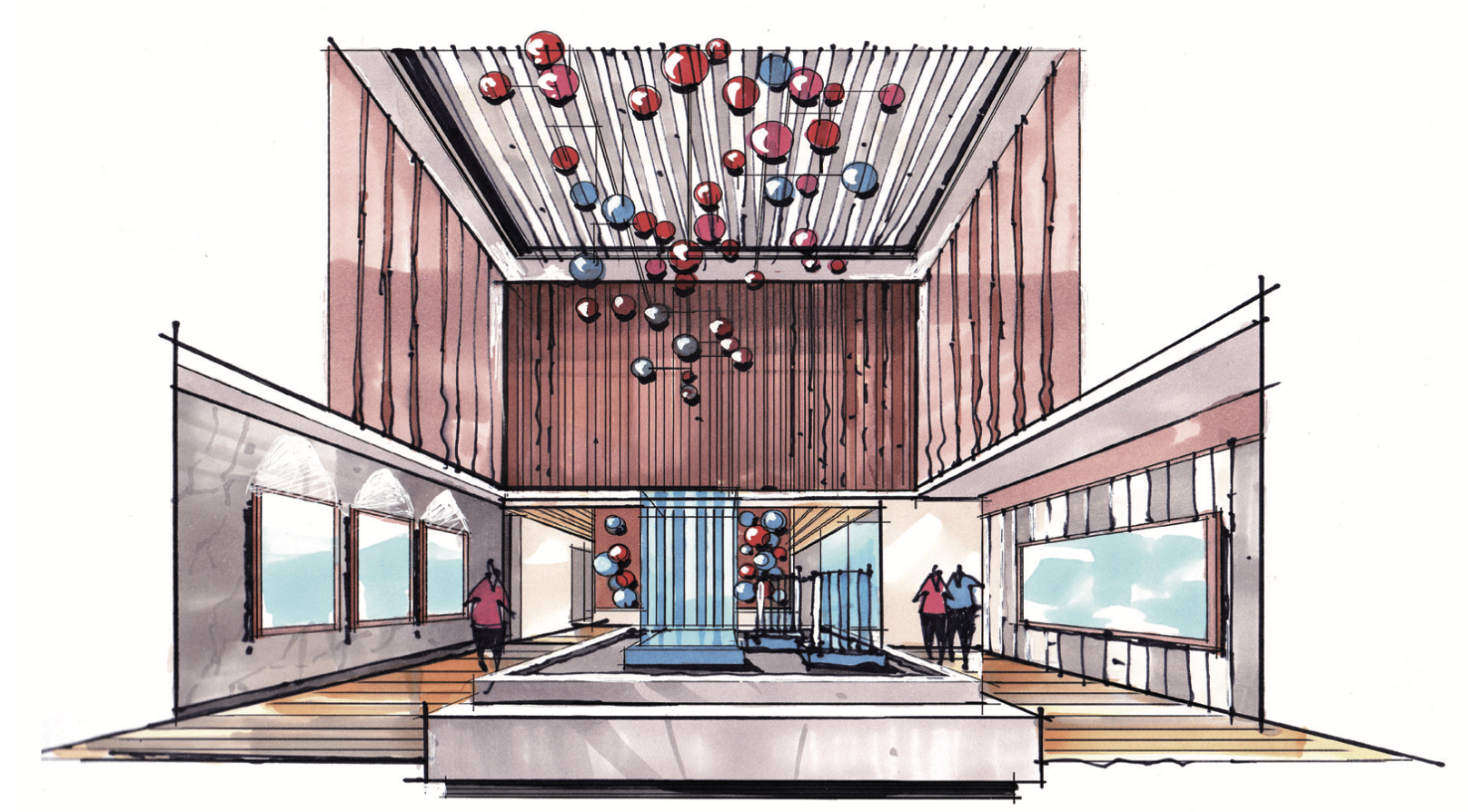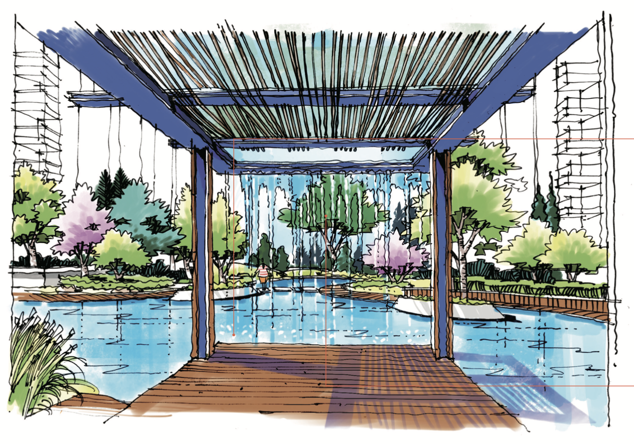 与横向构图不同的是它在横向切割时形成两条或多条的横向切割线,多条水平平行线的的切割通常能够带来平稳的画面感受,同时也带来较为宽广的画面感。通常横向切割线的节点也需要进行认真的考究选取,通过横向有序的切割构成关系通常能够带给画面静谧而稳定的静态美感。由于一点透视的结构框架正是平行于纸张的,所以当我们用一点透视作为透视框架时通常就会自然形成平行透视,所以平行构图在一点透视空间中非常常用。但一点透视空间本身就较为刻板单调,在利用平行构图时要善于打破平行的构图框架,来营造富有变化的空间层次,为此许多设计师运用植物、家具等的收边处理,来打破平行的结构线而获得画面层次感。