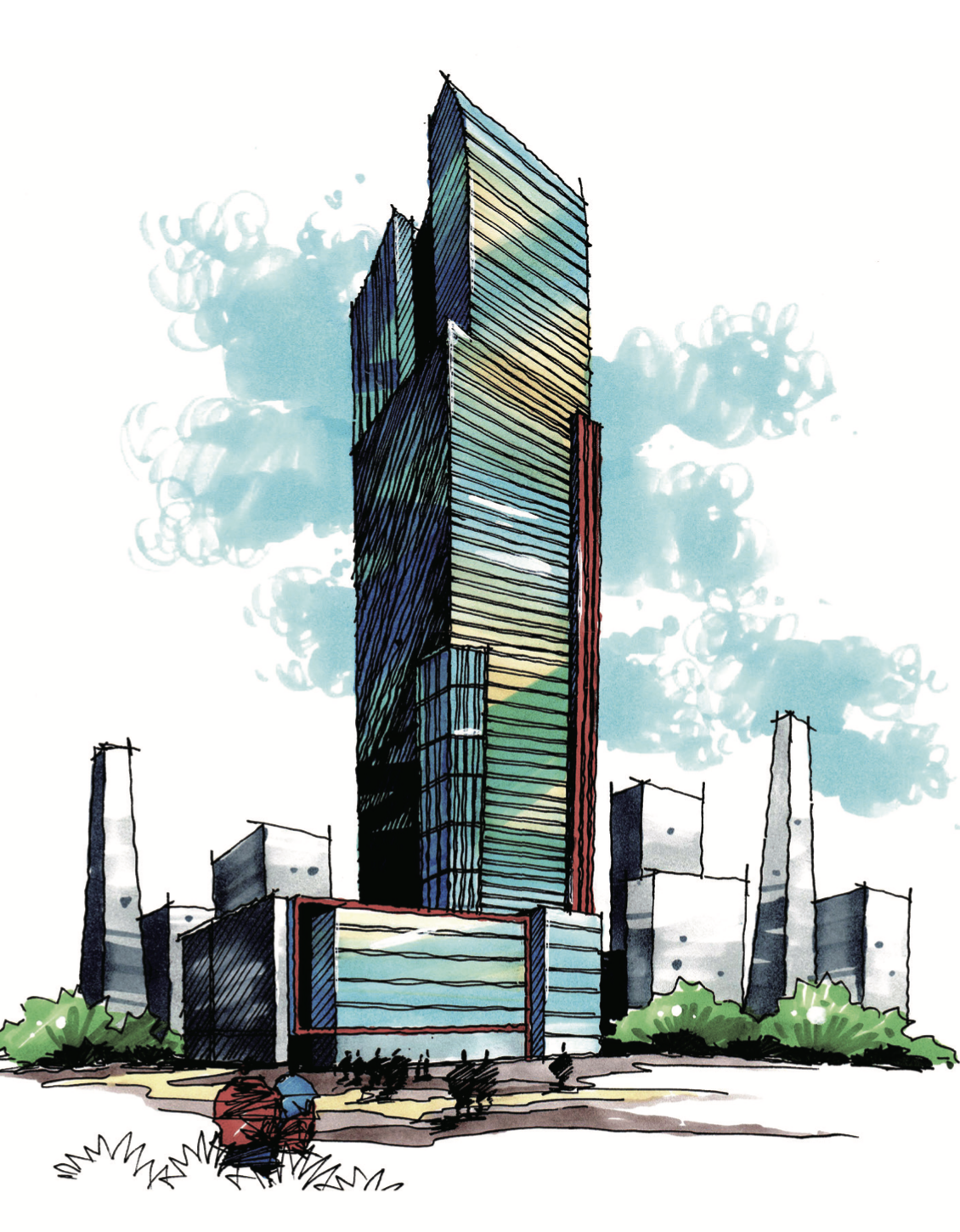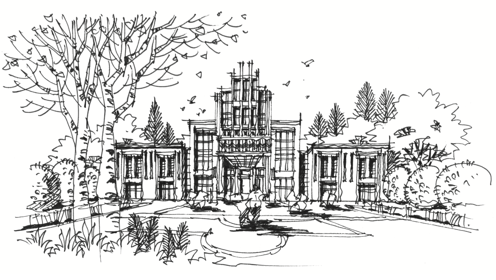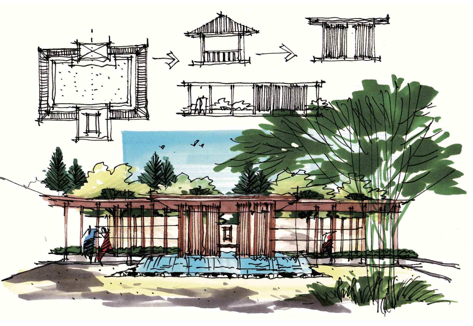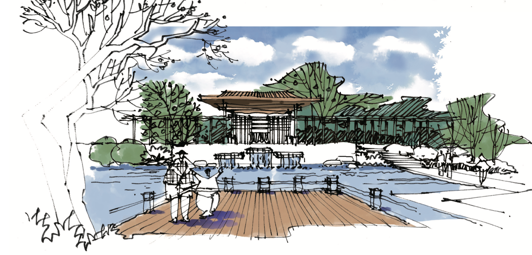 给人以满足、安定的感觉,画面通常对应而平衡,是看上去最自然、用得最多的一种构图形式。横向构图有利于表现高低起伏的节奏感,如果横画幅被加宽,则水平线的造型力将被更加强化,在绘制立面图时,利用这种构图形成常常能够较准确的反应结构间实际的比例关系。由于横向构图的水平张力感强,构图时如果能够准确的抓住画面中的横向切割点,便能在图面上呈现一种富有节奏韵律的构成感。进行该种构图时,三分切割法是最为常用的切割方式,它把天空,建筑物与地面分为三份,而不是三等分。在这三个关系中,通常有两个关系占据七成的比例,这就是常见的“三七律”构图,即是天空与建筑物占据上半部分七成的画面比例,剩余三成的画面比作为地面,或是反过来,地面与建筑物占七成的画面比例,而天空只占三成比例。这也是对黄金分割比例的一个很好的运用,被称为最佳的构图布局比例关系,是众多设计师运用非常广泛的一种构图形式。横向构图的切割比例以三七为常见,但并不唯独这样一种切割比例关系,在实际构图需要时四六、二八的比例也常常可见。