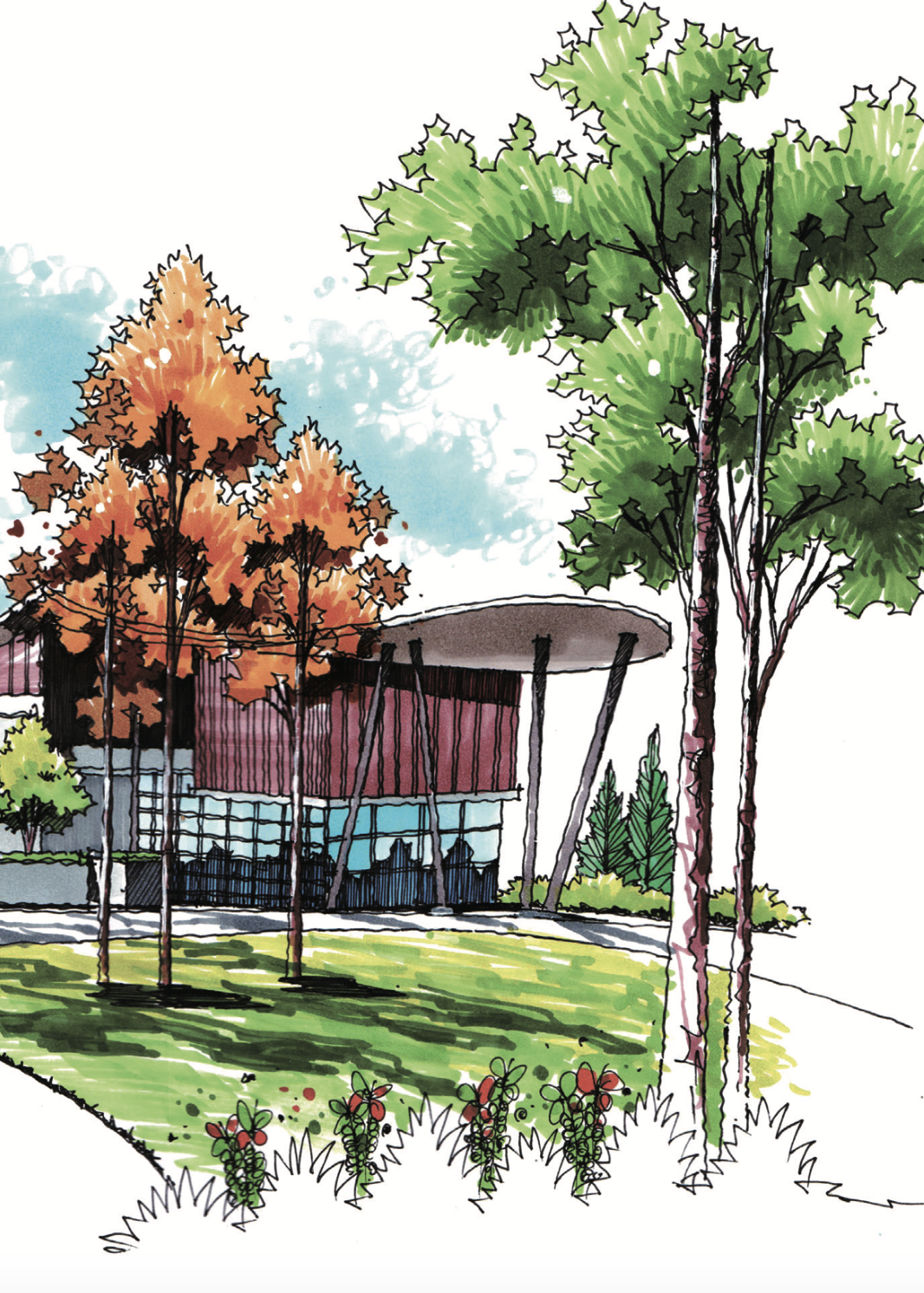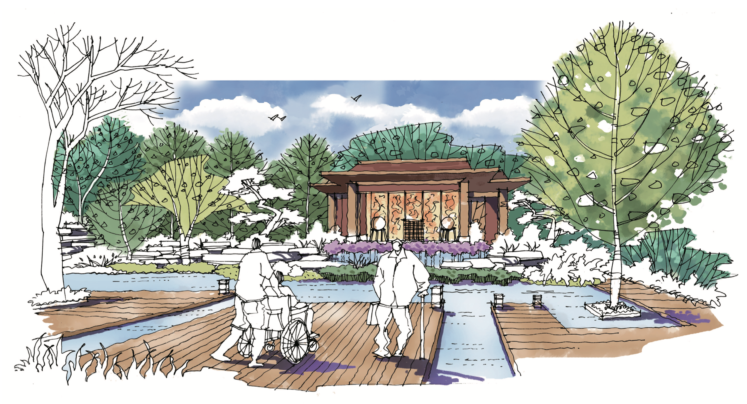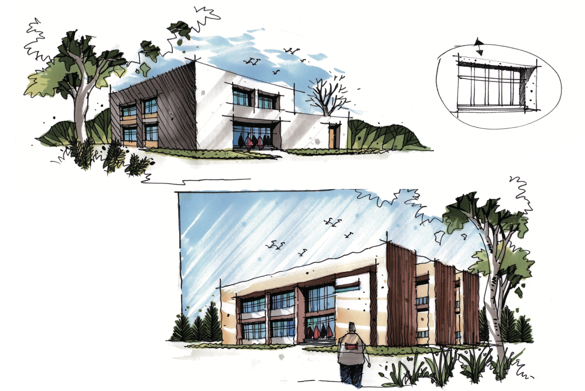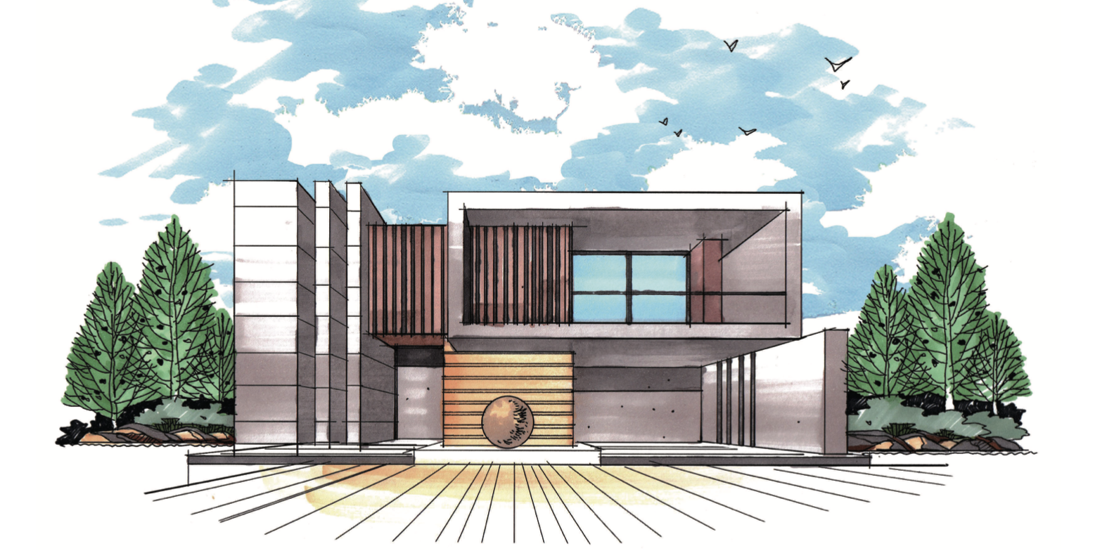 给人以满足、安定的感觉,画面通常对应而平衡,是看上去最自然、用得最多的一种构图形式。横向构图有利于表现高低起伏的节奏感,如果横画幅被加宽,则水平线的造型力将被更加强化,在绘制立面图时,利用这种构图形成常常能够较准确的反应结构间实际的比例关系。由于横向构图的水平张力感强,构图时如果能够准确的抓住画面中的横向切割点,便能在图面上呈现一种富有节奏韵律的构成感。进行该种构图时,三分切割法是最为常用的切割方式,它把天空,建筑物与地面分为三份,而不是三等分。在这三个关系中,通常有两个关系占据七成的比例,这就是常见的“三七律”构图,即是天空与建筑物占据上半部分七成的画面比例,剩余三成的画面比作为地面,或是反过来,地面与建筑物占七成的画面比例,而天空只占三成比例。这也是对黄金分割比例的一个很好的运用,被称为最佳的构图布局比例关系,是众多设计师运用非常广泛的一种构图形式。横向构图的切割比例以三七为常见,但并不唯独这样一种切割比例关系,在实际构图需要时四六、二八的比例也常常可见。