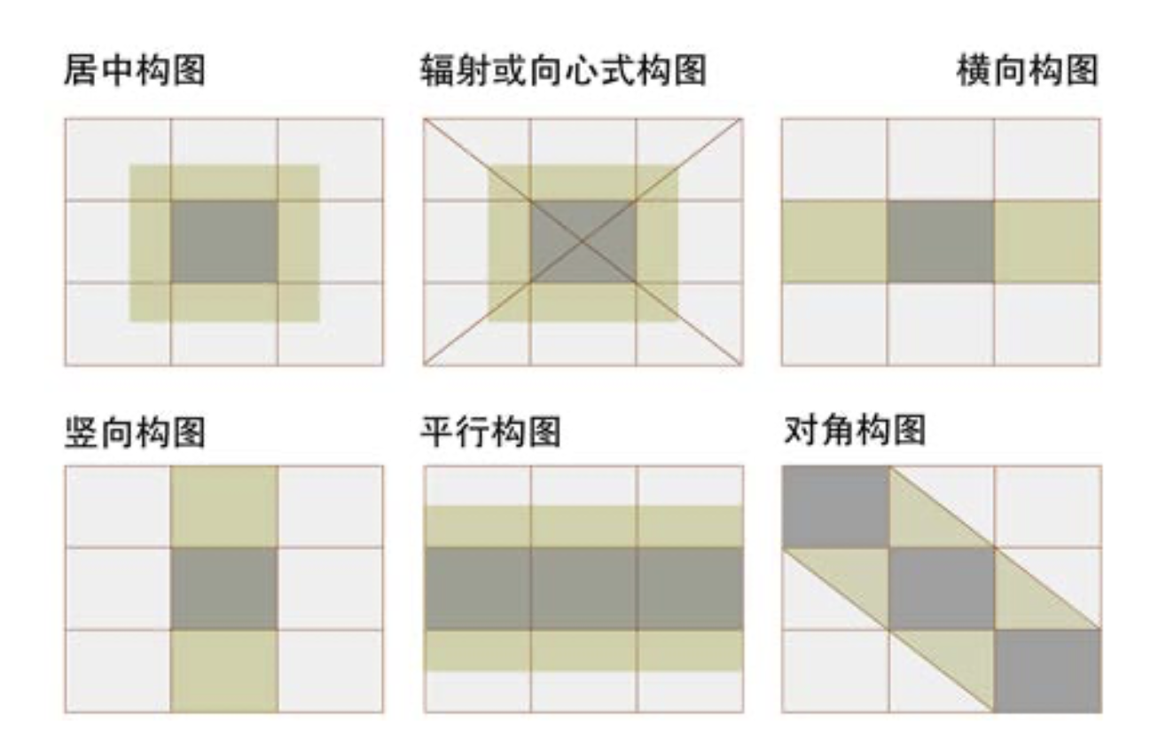 这里我们重点叙述六种常用的构图: 居中对称式构图、辐射或向心式构图、横向构图、竖向构图、平行构图、对角构图。