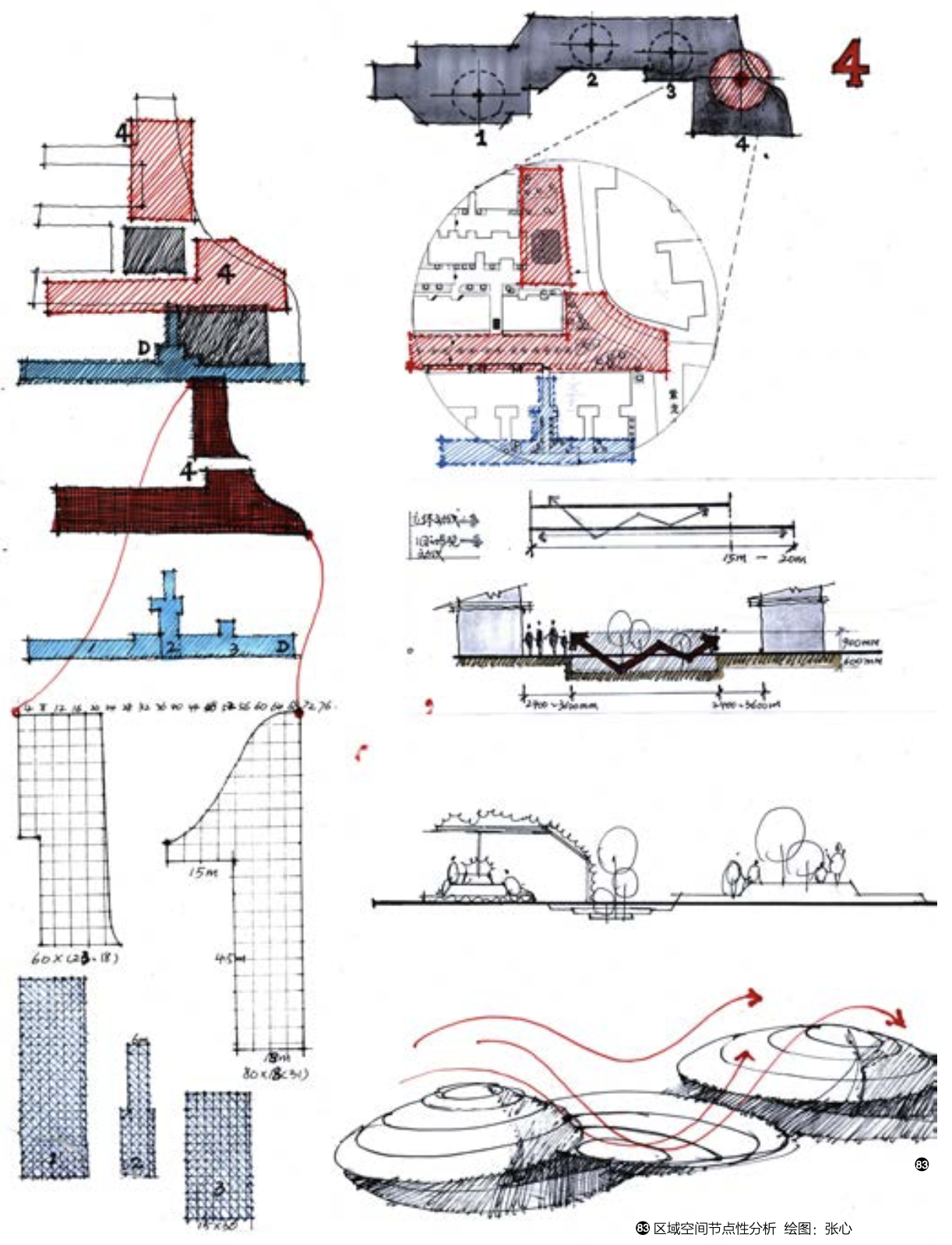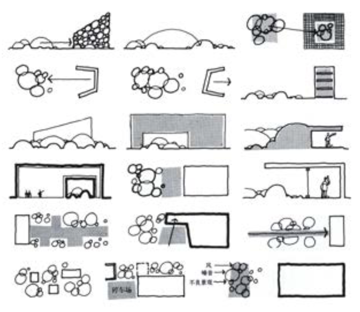 设计构想示意,一般用于向设计受众解说或传达设计者的设计概念,这个时候设计内容基于设计逻辑思维性引导已经有了基本的雏形。它用最简单图示方式,接近于漫画式的简单向设计受众方描述某一个设计的环节或某一内容,所以它要比前面的构成关系的符号示意要更具体一些。例如用一点一线来表示一个人,用方块的几何形态来表述建筑物体,用一个圆泡泡表述一棵树......这一阶段主要是表现设计内容中物件元素之间的关系,这时候图示不仅仅于平面的表达方式,多以立面图、轴侧图等为常见的表达方式。